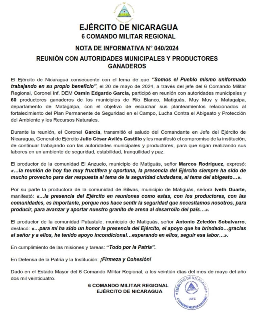 El Ejército de Nicaragua consecuente con el lema de que "Somos el Pueblo mismo uniformado trabajando en su propio beneficio", el 20 de mayo de 2024, a través del jefe del 6 Comando Militar Regional, Coronel Inf. DEM Osmin Edgardo García, participó en reunión con autoridades municipales y 60 productores ganaderos de los municipios de Rio Blanco, Matiguás, Muy Muy y Matagalpa, departamento de Matagalpa, con el objetivo de escuchar sus planteamientos relacionados al fortalecimiento del Plan Permanente de Seguridad en el Campo, Lucha Contra el Abigeato y Protección del Ambiente y los Recursos Naturales.