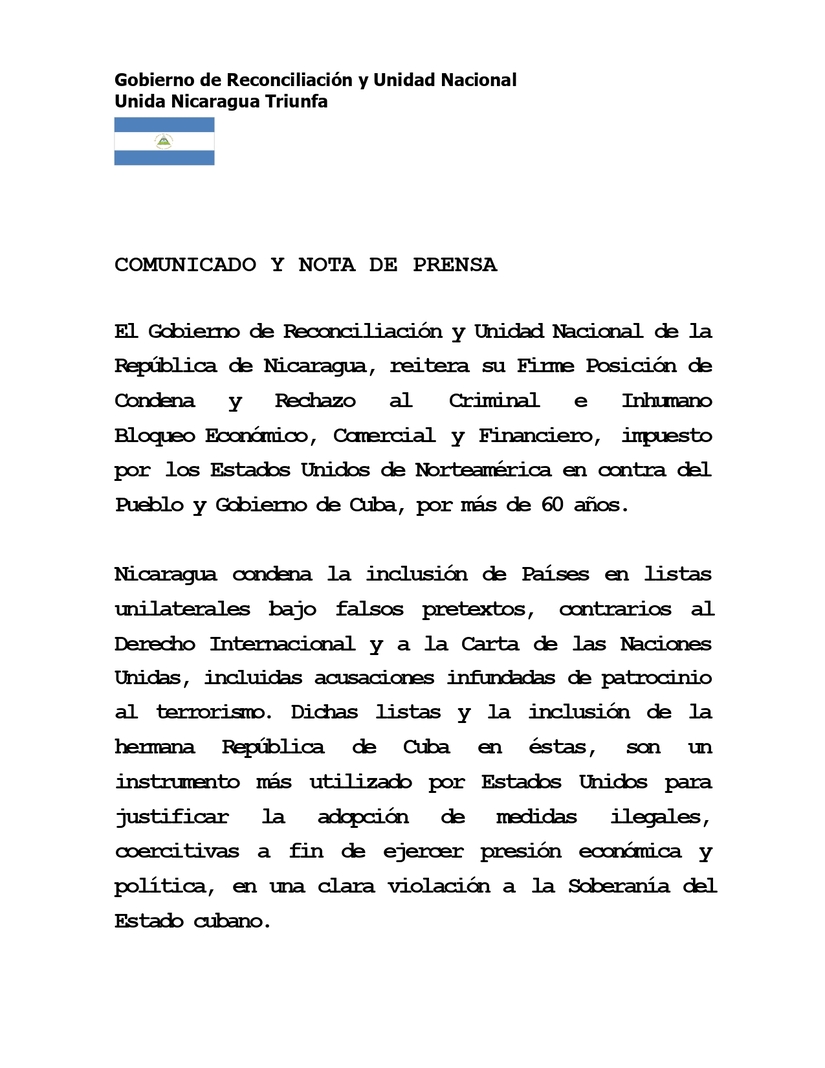 The Government of Reconciliation and National Unity of the Republic of Nicaragua reiterates its Firm Position of Condemnation and Rejection of the Criminal and Inhuman Economic, Commercial and Financial Blockade imposed by the United States of America against the People and Government of Cuba for more than 60 years.
