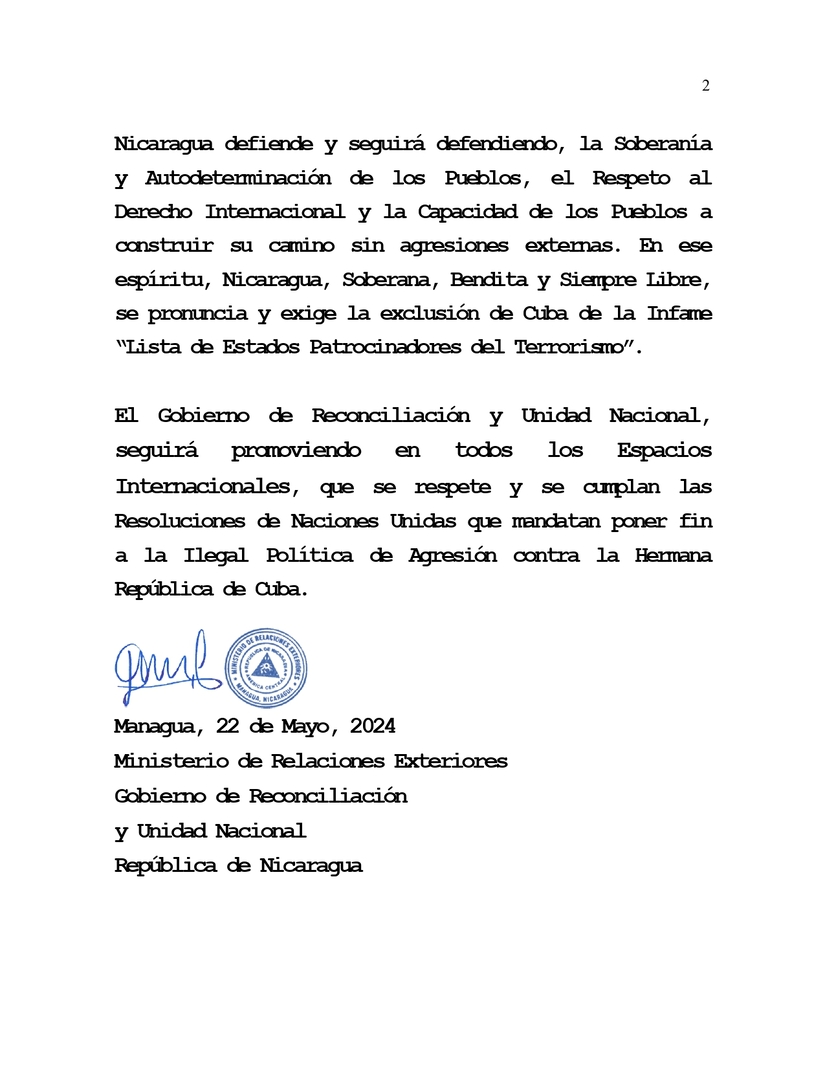 Nicaragua defiende y seguirá defendiendo, la Soberanía y Autodeterminación de los Pueblos, el Respeto al Derecho Internacional y la Capacidad de los Pueblos a construir su camino sin agresiones externas. En ese espíritu, Nicaragua, Soberana, Bendita y Siempre Libre, se pronuncia y exige la exclusión de Cuba de la Infame “Lista de Estados Patrocinadores del Terrorismo”.