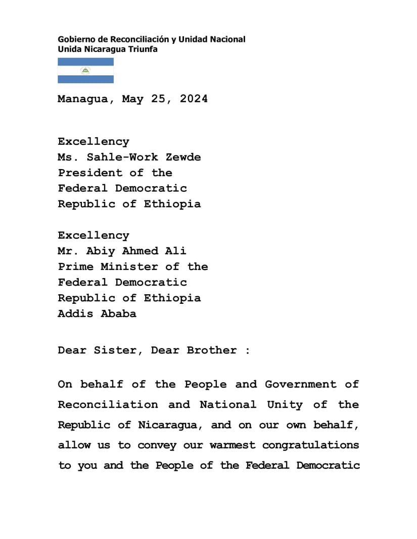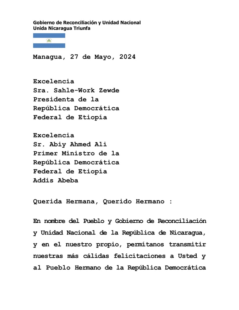 Mensaje del Presidente Comandante Daniel Ortega y la Vicepresidenta Compañera Rosario Murillo, a Sus Excelencias, Hermana Sahle-Work Zewde y Hermano Abiy Ahmed Ali, Presidenta y Primer Ministro de la República Democrática Federal de Etiopía, respectivamente, al conmemorarse el Día Nacional en ese Hermano País.