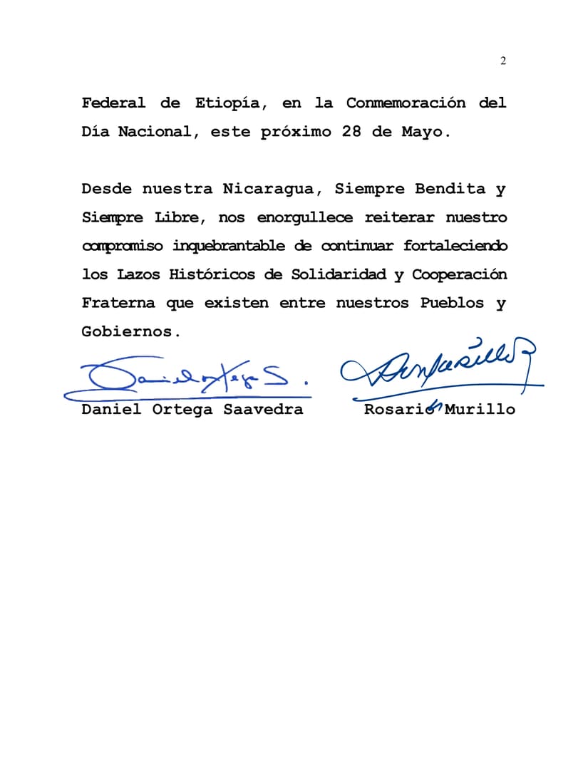 En nombre del Pueblo y Gobierno de Reconciliación y Unidad Nacional de la República de Nicaragua, y en el nuestro propio, permítanos transmitir nuestras más cálidas felicitaciones a Usted y al Pueblo Hermano de la República Democrática Federal de Etiopía, en la Conmemoración del Día Nacional, este próximo 28 de Mayo.