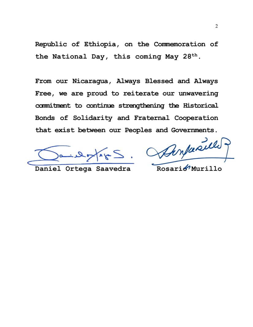 On behalf of the People and Government of Reconciliation and National Unity of the Republic of Nicaragua, and on our own behalf, allow us to convey our warmest congratulations to you and the People of the Federal Democratic Republic of Ethiopia, on the Commemoration of the National Day, this coming May 28th.