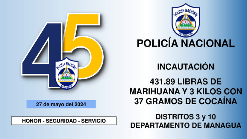 Como resultado del Plan de Vigilancia y Patrullaje, la Policía Nacional incautó 431.89 libras de marihuana y 3 kilos con 37 gramos de cocaína en los distritos 3 y 10 de Managua, informó a través de una conferencia de prensa el Comisionado General Victoriano Ruiz, Jefe de la Dirección de Auxilio Judicial.