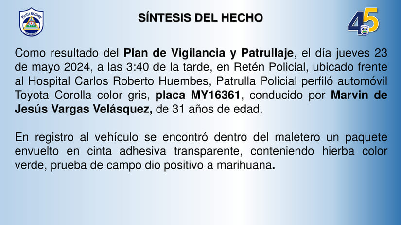 En los detalles, el mando policial, compartió que el día jueves 23 de mayo 2024, a las 3:40 de la tarde, en un retén ubicado frente al Hospital Carlos Roberto Huembes, las autoridades policiales perfiló el automóvil Toyota Corolla color gris, placa MY16361, conducido por Marvin de Jesús Vargas Velásquez, de 31 años de edad.