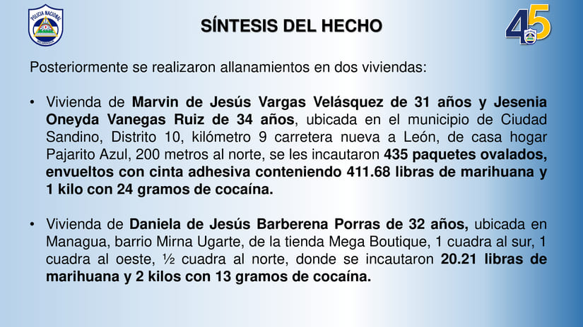 Agregó que "posteriormente se realizaron allanamientos en dos viviendas: vivienda de Marvin de Jesús Vargas Velásquez de 31 años y Jesenia Oneyda Vanegas Ruiz de 34 años, ubicada en el municipio de Ciudad Sandino, Distrito 10, kilómetro 9 carretera nueva a León, de casa hogar Pajarito Azul, 200 metros al norte, donde se incautaron 435 paquetes ovalados, envueltos con cinta adhesiva conteniendo 411.68 libras de marihuana y 1 kilo con 24 gramos de cocaína".