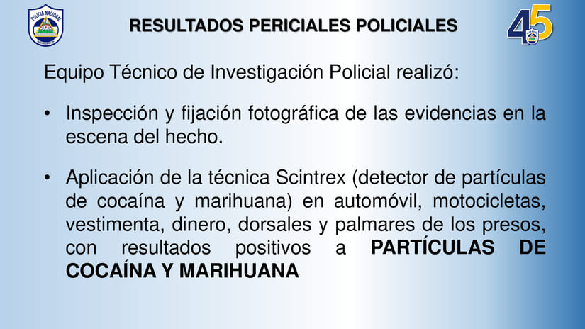 Asimismo, comentó que el equipo Técnico de Investigación Policial realizó la inspección y fijación fotográfica de las evidencias en la escena del hecho, aplicación de la técnica Scintrex (detector de partículas de cocaína y marihuana) en automóvil, motocicletas, vestimenta, dinero, dorsales y palmares de los presos, con resultados positivos a partículas de cocaína y marihuana.