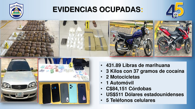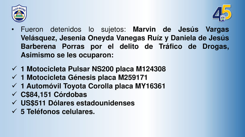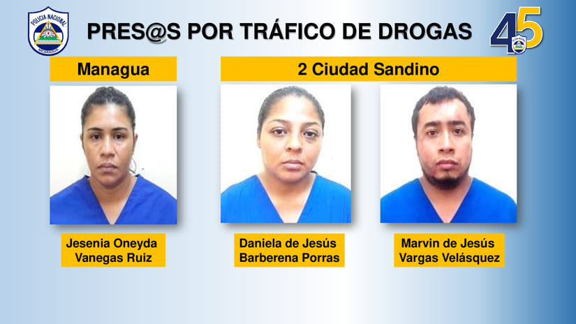 "Fueron detenidos los sujetos: Marvin de Jesús Vargas Velásquez, Jesenia Oneyda Vanegas Ruíz y Daniela de Jesús Barberena Porras por el delito de tráfico de drogas. Asimismo se les ocuparon: una motocicleta Pulsar NS200 placa M124308, una motocicleta Génesis placa M259171, un automóvil Toyota Corolla placa MY16361, 84 mil 151 córdobas, 511 dólares estadounidenses y 5 teléfonos celulares", enfatizó el mando policial.