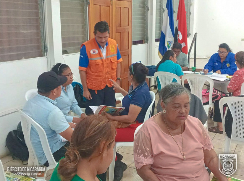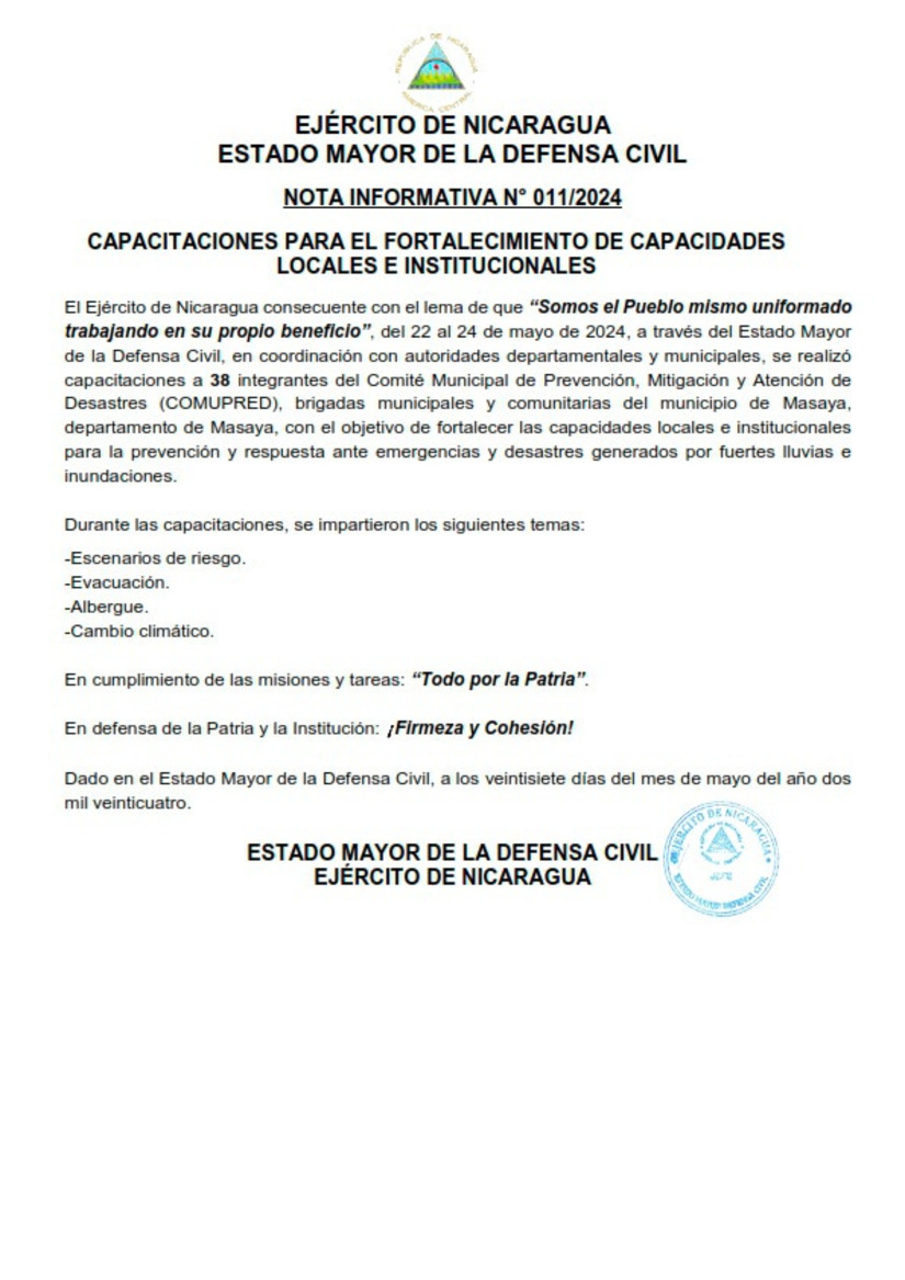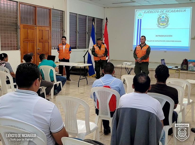 El Ejército de Nicaragua consecuente con el lema de que "Somos el Pueblo mismo uniformado trabajando en su propio beneficio", del 22 al 24 de mayo de 2024, a través del Estado Mayor de la Defensa Civil, en coordinación con autoridades departamentales y municipales, se realizó capacitaciones a 38 integrantes del Comité Municipal de Prevención, Mitigación y Atención de Desastres (COMUPRED), brigadas municipales y comunitarias del municipio de Masaya, departamento de Masaya, con el objetivo de fortalecer las capacidades locales e institucionales para la prevención y respuesta ante emergencias y desastres generados por fuertes lluvias e inundaciones.