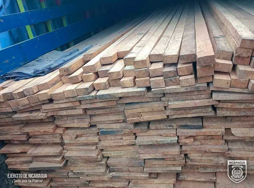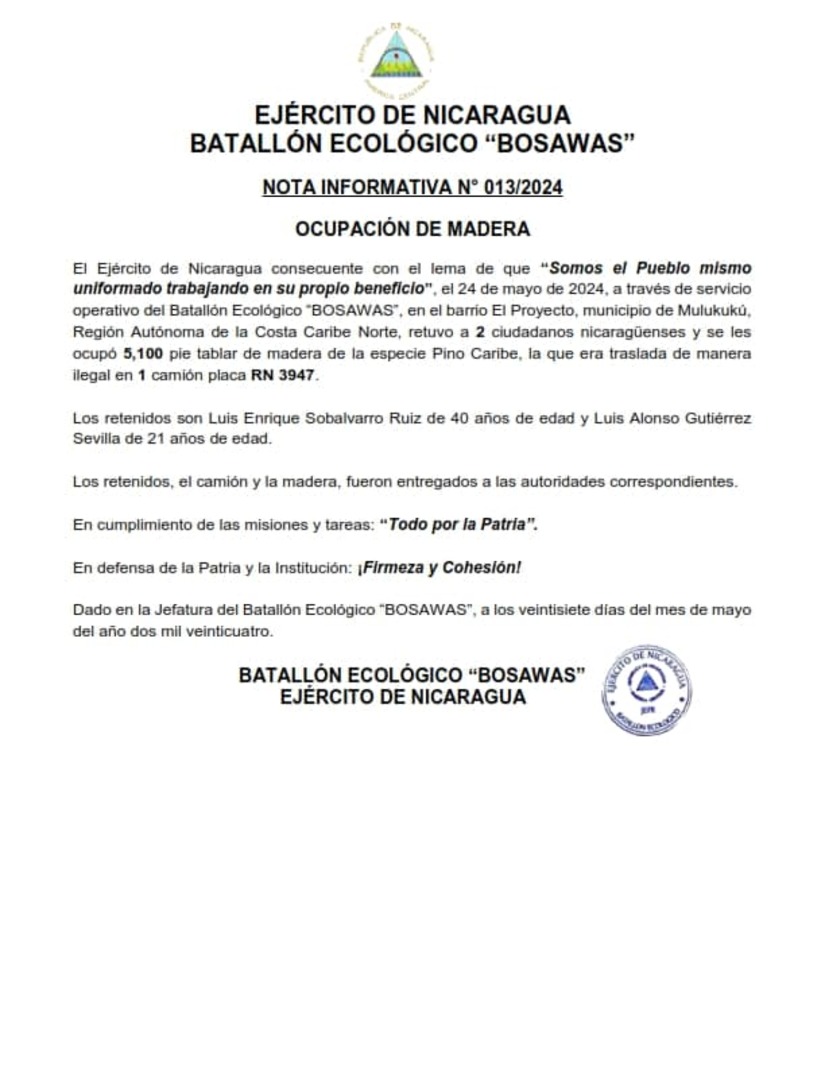 El Ejército de Nicaragua consecuente con el lema de que "Somos el Pueblo mismo uniformado trabajando en su propio beneficio", el 24 de mayo de 2024, a través de servicio operativo del Batallón Ecológico "BOSAWAS", en el barrio El Proyecto, municipio de Mulukukú, Región Autónoma de la Costa Caribe Norte, retuvo a 2 ciudadanos nicaragüenses y se les ocupó 5,100 pie tablar de madera de la especie Pino Caribe, la que era traslada de manera ilegal en 1 camión placa RN 3947.