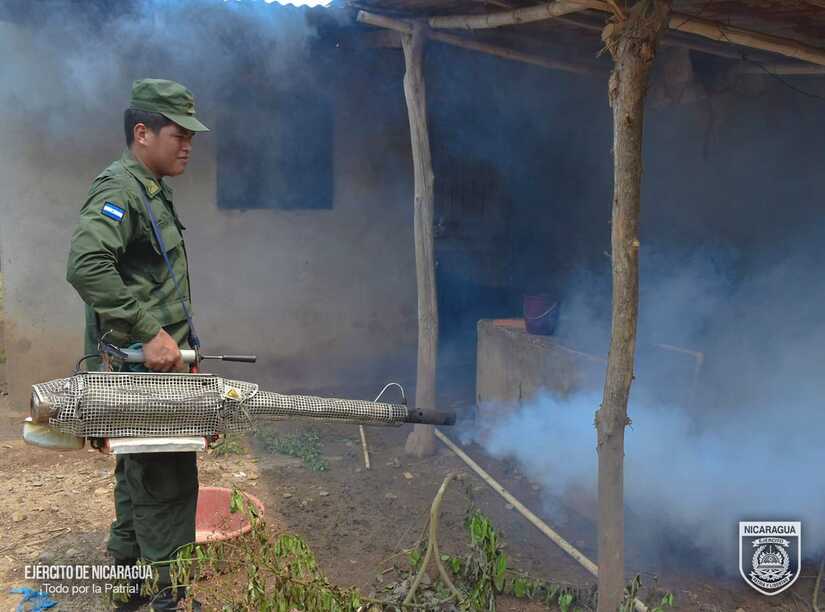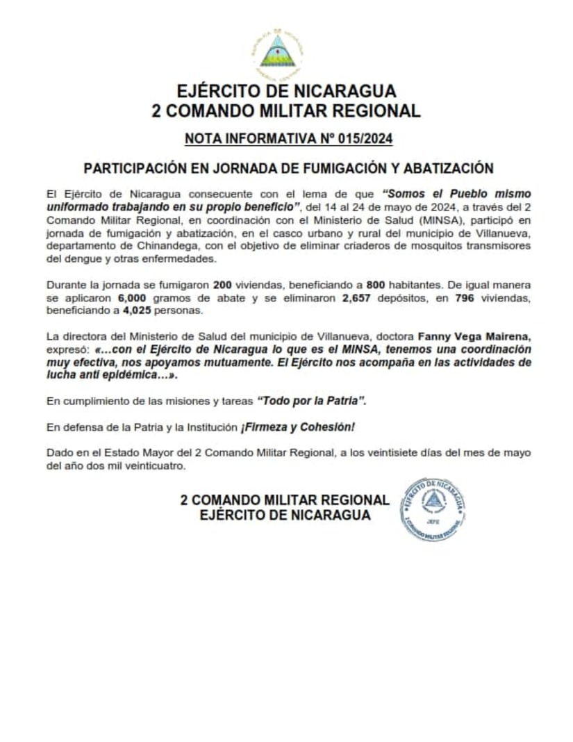 El Ejército de Nicaragua consecuente con el lema de que "Somos el Pueblo mismo uniformado trabajando en su propio beneficio", del 14 al 24 de mayo de 2024, a través del 2 Comando Militar Regional, en coordinación con el Ministerio de Salud (MINSA), participó en jornada de fumigación y abatización, en el casco urbano y rural del municipio de Villanueva, departamento de Chinandega, con el objetivo de eliminar criaderos de mosquitos transmisores del dengue y otras enfermedades.