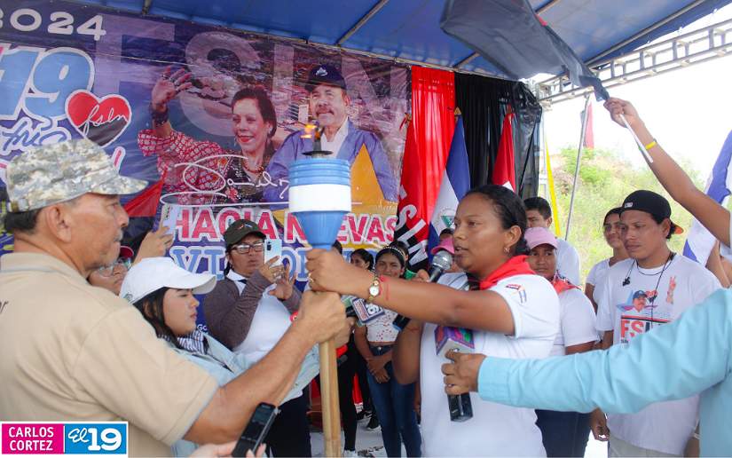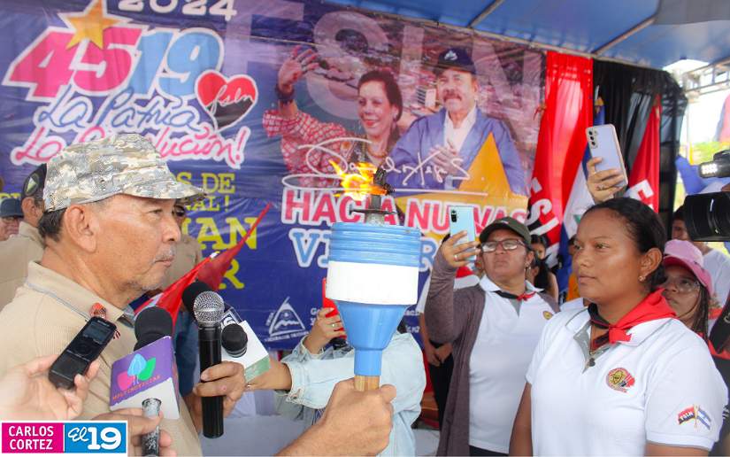 "En este momento entregamos la antorcha para el relevo a la Juventud Sandinista 19 de Julio, por todos esos mártires desde el tiempo del General Benjamín Zeledón, Augusto C. Sandino, la fundación del Frente Sandinista de Liberación Nacional, los militantes de la segunda promoción del Frente Sandinista de Liberación Nacional entregamos a los nuevos relevos que son los jóvenes del pueblo nicaragüense", expresó el combatiente histórico José María Guadamuz, al entregar la antorcha a la juventud.
