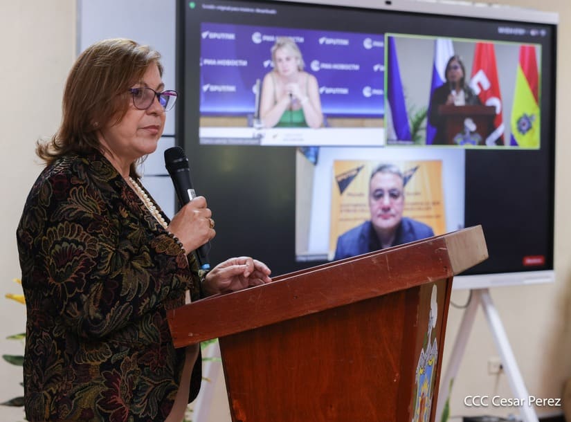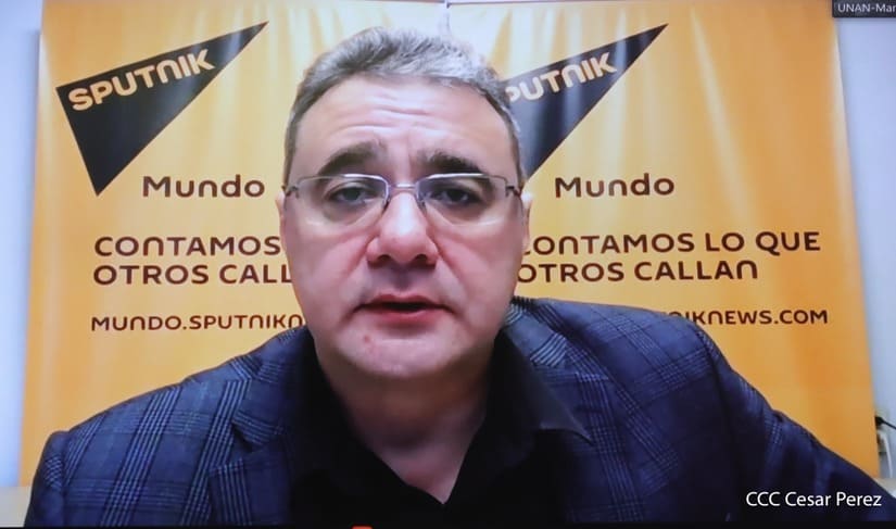 “Hermanos y hermanas, desde Nicaragua Bendita y Siempre libre, Nicaragua de Darío y Sandino, queremos trasladarles de parte de nuestro Presidente Comandante Daniel Ortega Saavedra, de nuestra Vicepresidenta la Compañera Rosario Murillo y de parte del pueblo de Nicaragua, el saludo, el cariño y el abrazo al Presidente de la Federación de Rusia compañero y hermano Vladímir Putin, a su pueblo valiente y heroico y a todos los compañeros y compañeras de la Agencia de Noticias Sputnik, también a todos los hermanos estudiantes de comunicación de la UNAN-Managua y todos los compañeros que están conectados en esta sesión de trabajo, le hacemos llegar ese abrazo y el cariño de parte de nuestro Presidente Comandante Daniel y nuestra Vicepresidenta de la Compañera Rosario”, subrayó.