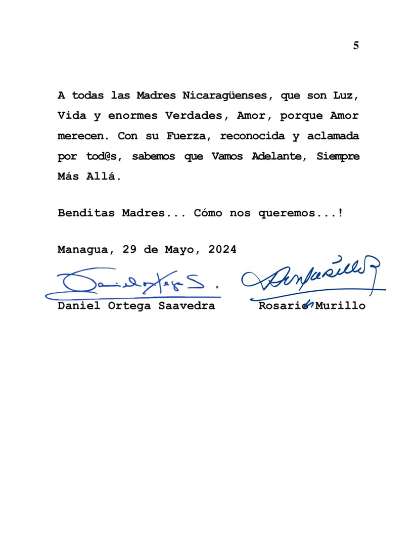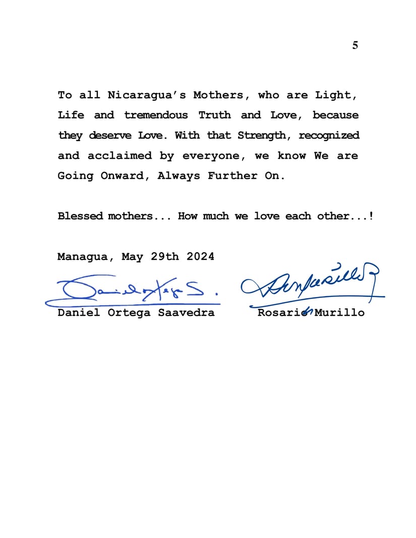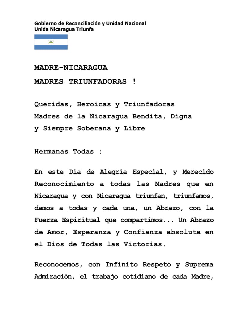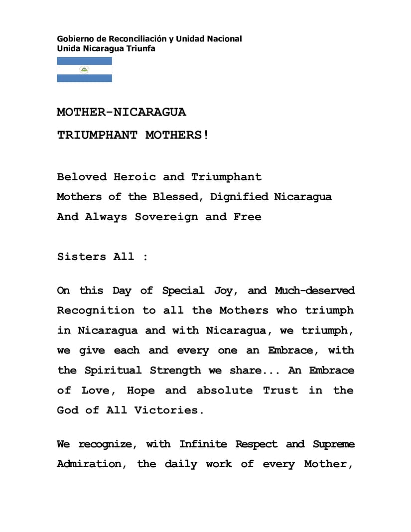 On this Day of Special Joy, and Much-deserved Recognition to all the Mothers who triumph in Nicaragua and with Nicaragua, we triumph, we give each and every one an Embrace, with the Spiritual Strength we share... An Embrace of Love, Hope and absolute Trust in the God of All Victories.