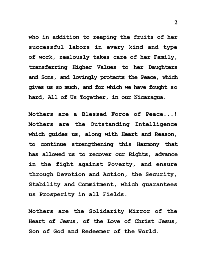 We recognize, with Infinite Respect and Supreme Admiration, the daily work of every Mother, who in addition to reaping the fruits of her successful labors in every kind and type of work, zealously takes care of her Family, transferring Higher Values to her Daughters and Sons, and lovingly protects the Peace, which gives us so much, and for which we have fought so hard, All of Us Together, in our Nicaragua.