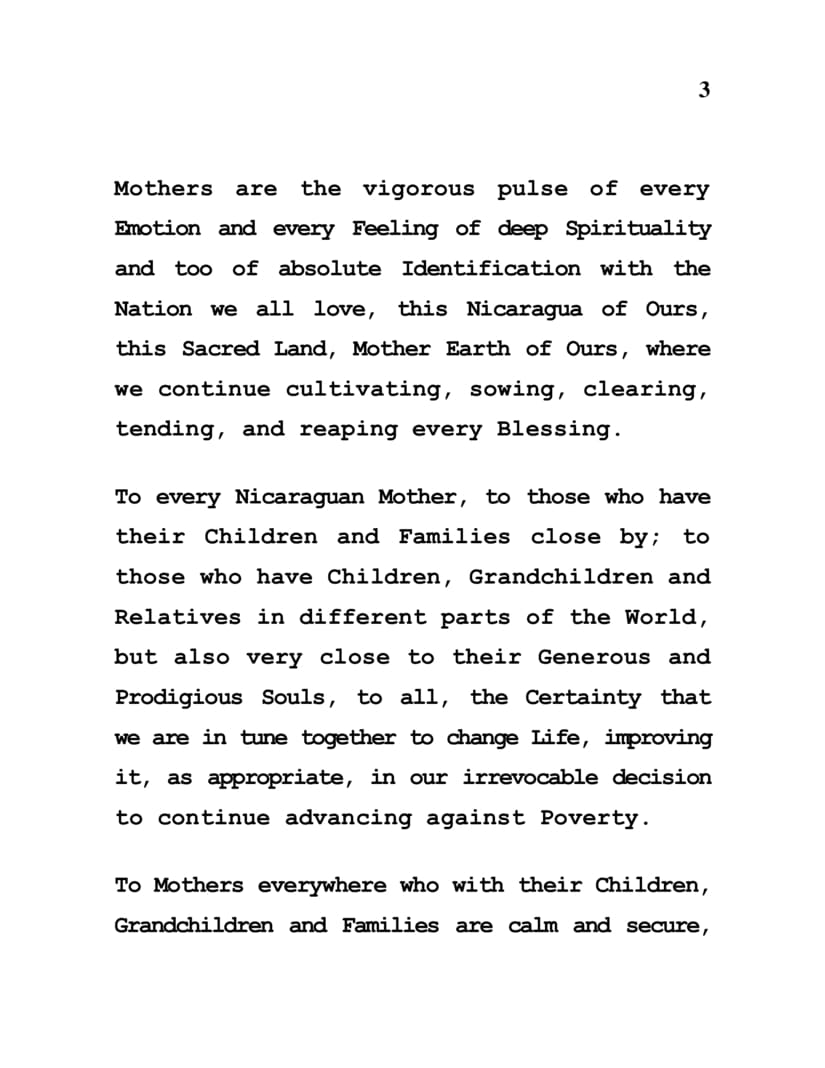 Mothers are the vigorous pulse of every Emotion and every Feeling of deep Spirituality and too of absolute Identification with the Nation we all love, this Nicaragua of Ours, this Sacred Land, Mother Earth of Ours, where we continue cultivating, sowing, clearing, tending, and reaping every Blessing.