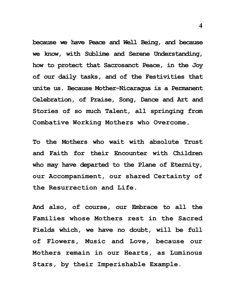 To Mothers everywhere who with their Children, Grandchildren and Families are calm and secure, because we have Peace and Well Being, and because we know, with Sublime and Serene Understanding, how to protect that Sacrosanct Peace, in the Joy of our daily tasks, and of the Festivities that unite us. Because Mother-Nicaragua is a Permanent Celebration, of Praise, Song, Dance and Art and Stories of so much Talent, all springing from Combative Working Mothers who Overcome.