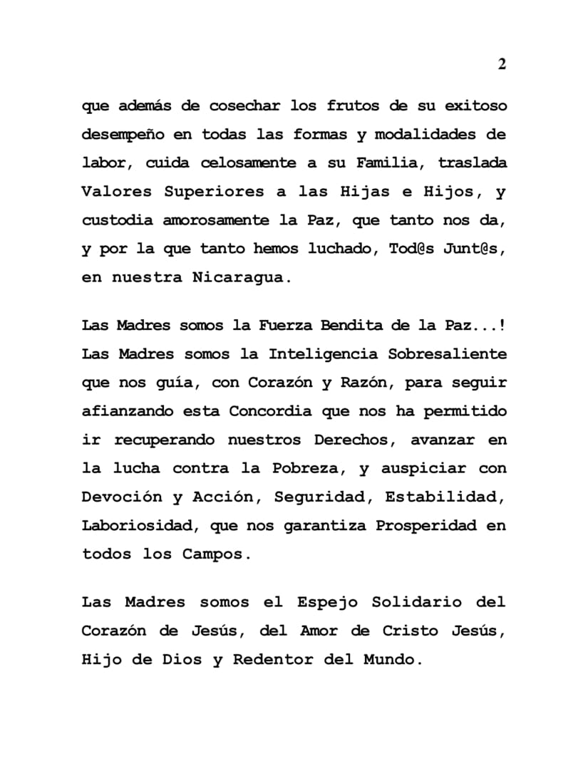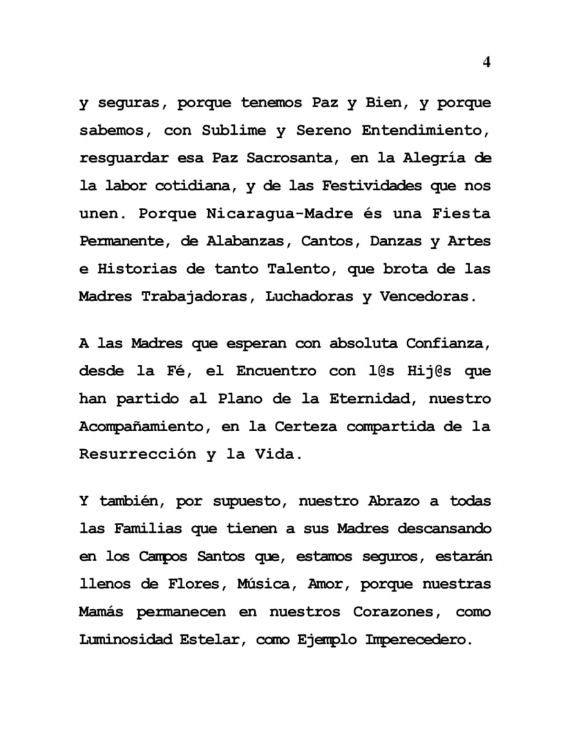 A las Madres que con sus Hij@s, Niet@s y Familias están en todas partes, tranquilas y seguras, porque tenemos Paz y Bien, y porque sabemos, con Sublime y Sereno Entendimiento, resguardar esa Paz Sacrosanta, en la Alegría de la labor cotidiana, y de las Festividades que nos unen. Porque Nicaragua-Madre és una Fiesta Permanente, de Alabanzas, Cantos, Danzas y Artes e Historias de tanto Talento, que brota de las Madres Trabajadoras, Luchadoras y Vencedoras.