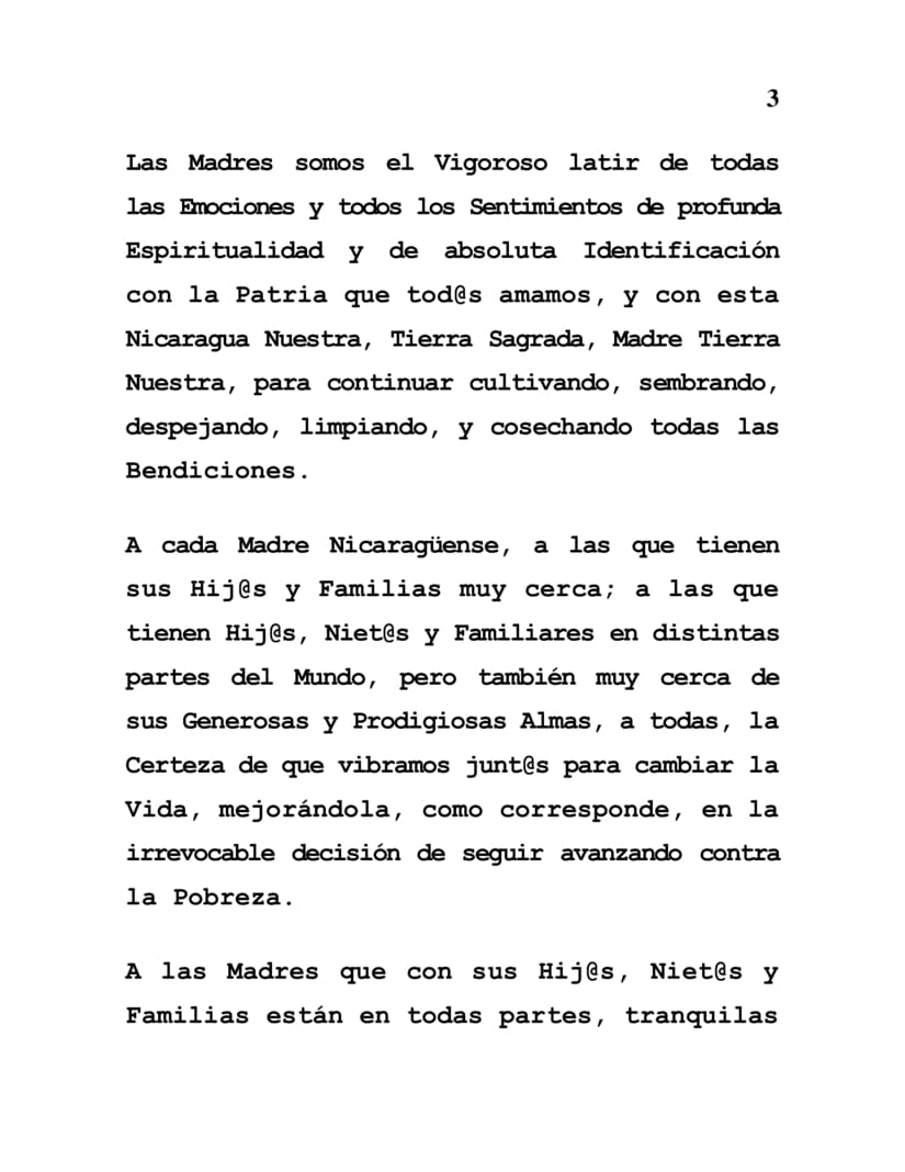A cada Madre Nicaragüense, a las que tienen sus Hij@s y Familias muy cerca; a las que tienen Hij@s, Niet@s y Familiares en distintas partes del Mundo, pero también muy cerca de sus Generosas y Prodigiosas Almas, a todas, la Certeza de que vibramos junt@s para cambiar la Vida, mejorándola, como corresponde, en la irrevocable decisión de seguir avanzando contra la Pobreza.