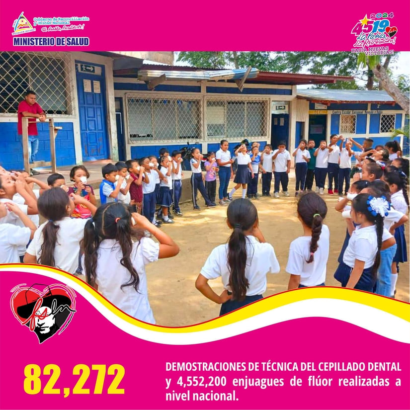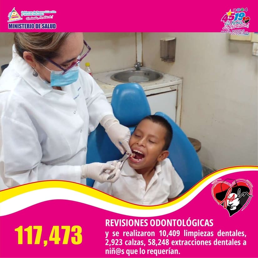 • 117,473 revisiones dentales, además hemos realizado 10,409 limpiezas dentales, 2,923 calzas, 58,248 extracciones, 82,272 demostraciones de la buena técnica del cepillado dental y 4,552,200 enjuagues de flúor realizados.