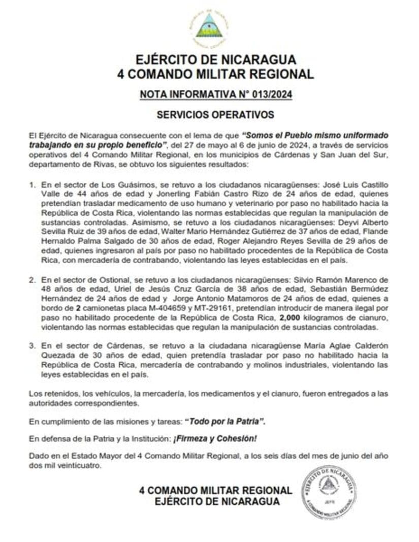 El Ejército de Nicaragua consecuente con el lema de que "Somos el Pueblo mismo uniformado trabajando en su propio beneficio", del 27 de mayo al 6 de junio de 2024, a través de servicios operativos del 4 Comando Militar Regional, en los municipios de Cárdenas y San Juan del Sur, departamento de Rivas, se obtuvo los siguientes resultados:
