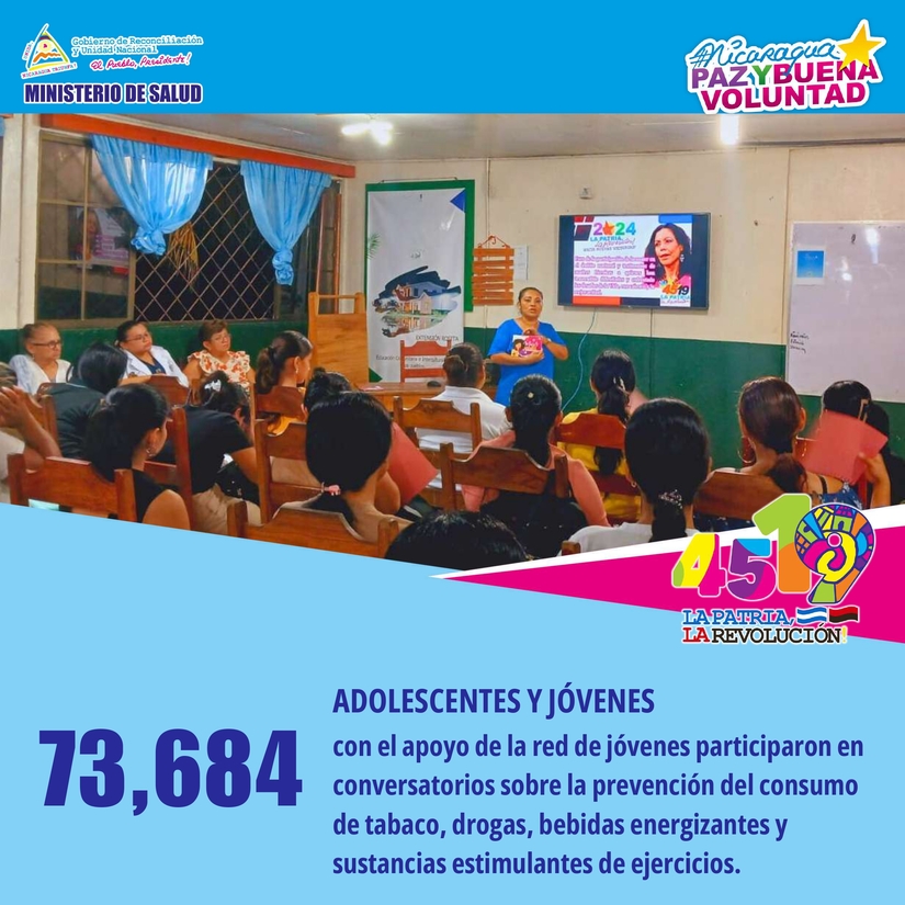 • 73,684 adolescentes y jóvenes con el apoyo de la red de jóvenes participaron en conversatorios sobre la prevención del consumo de tabaco, drogas, bebidas energizantes y sustancias estimulantes de ejercicios.
