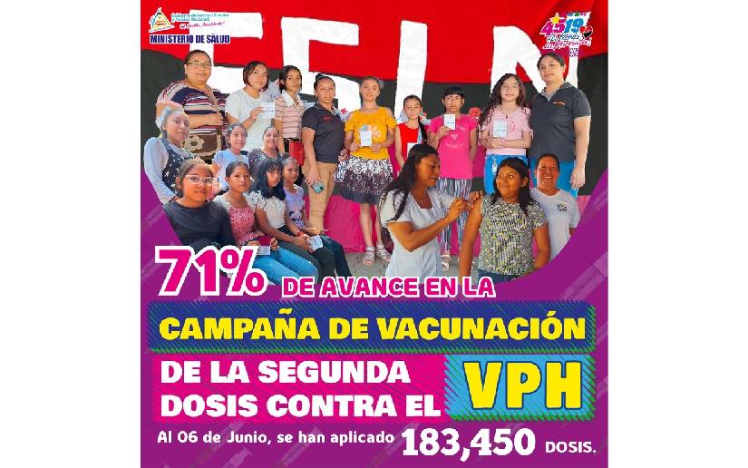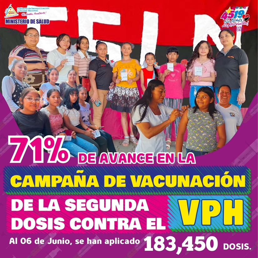 Nuestro Buen Gobierno Sandinista, en conjunto con la Red Comunitaria, Autoridades Locales, Trabajadores de la Salud y la población en general, del 06 de Mayo al 15 de Julio 2024, estamos realizando la Campaña de Vacunación de la segunda dosis contra el Virus del Papiloma Humano (VPH).
