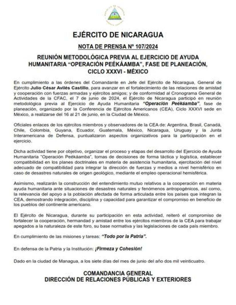 En cumplimiento a las órdenes del Comandante en Jefe del Ejército de Nicaragua, General de Ejército Julio César Avilés Castillo, para avanzar en el fortalecimiento de las relaciones de amistad y cooperación con fuerzas armadas y ejércitos amigos; y de conformidad al Cronograma General de Actividades de la CFAC, el 7 de junio de 2024, el Ejército de Nicaragua participó en reunión metodológica previa al Ejercicio de Ayuda Humanitaria "Operación Peékáamba", fase de planeación, organizado por la Conferencia de Ejércitos Americanos (CEA), Ciclo XXXVI sede en México, a realizarse del 16 al 21 de junio, en la Ciudad de México.