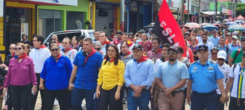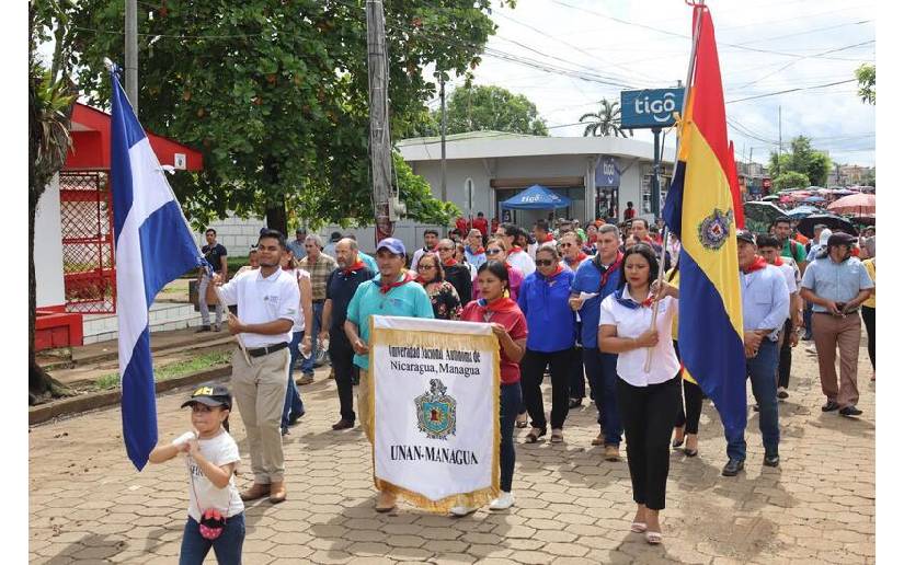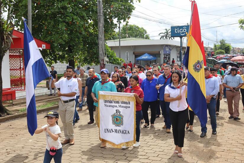 En saludo al 45/19 estudiantes, alcaldes, secretarios políticos, autoridades universitarias y pobladores participan en una Caminata Victoriosa como parte de la celebración de las Victorias Educativas del Programa Universidad en el Campo, UNICAM, de la UNAN-Managua que garantiza el Gobierno Sandinista, donde 21 estudiantes de las sedes ubicadas en los Departamentos de Zelaya Central y Río San Juan, recibieron el premio a la Excelencia Académica Integral 2024, en un acto realizado en la cancha municipal del parque central del Municipio de Nueva Guinea.