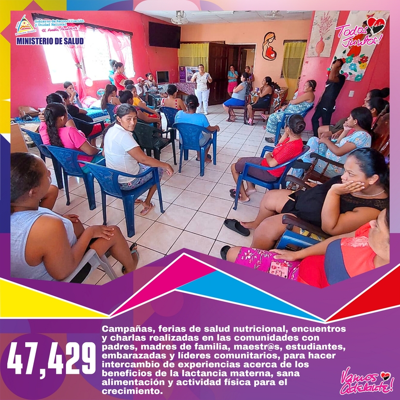 • 47,429 Campañas, Ferias de Salud Nutricional, Encuentros y Charlas realizadas en las comunidades con padres, madres de familia, maestr@s, estudiantes, embarazadas y líderes comunitarios, para hacer intercambio de experiencia acerca de los beneficios de la lactancia materna, sana alimentación y actividad física para el crecimiento.