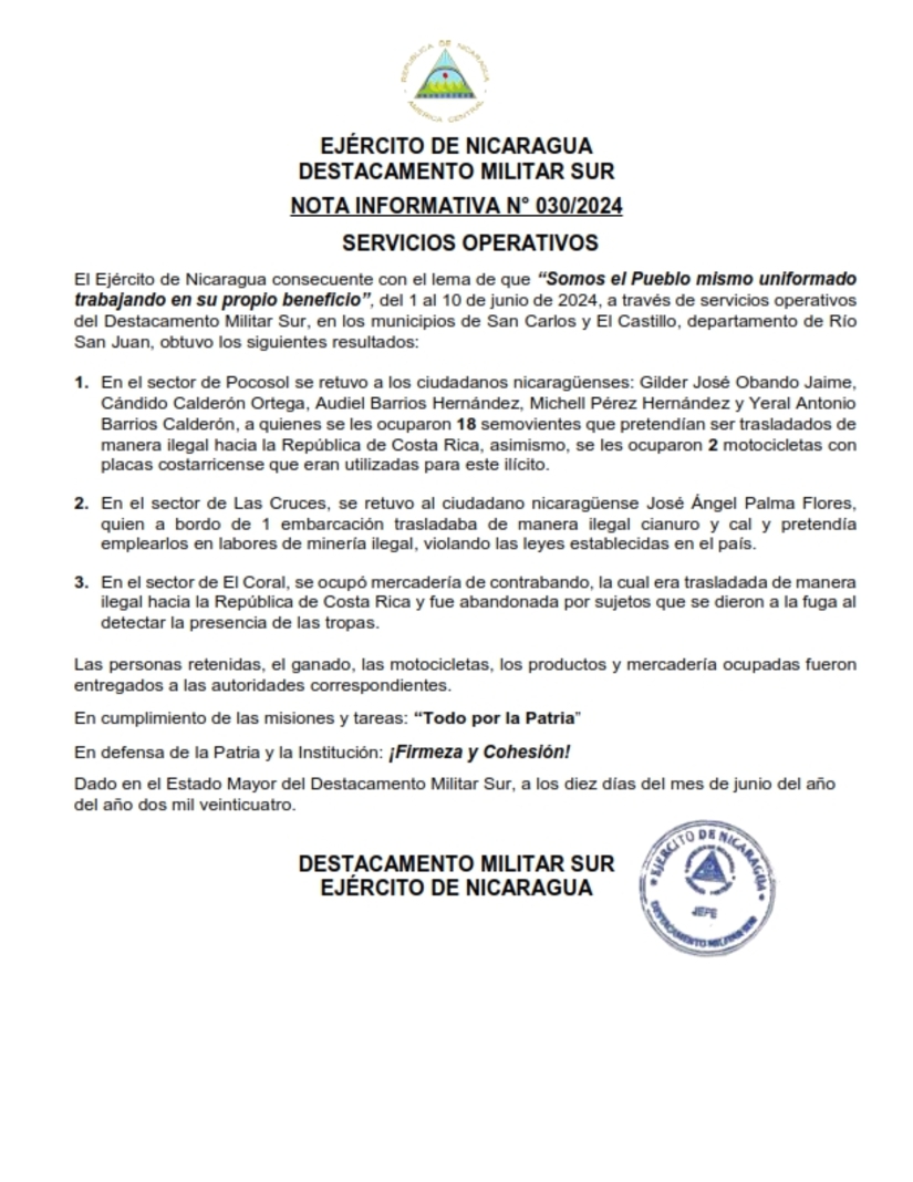 El Ejército de Nicaragua consecuente con el lema de que “Somos el Pueblo mismo uniformado trabajando en su propio beneficio”, del 1 al 10 de junio de 2024, a través de servicios operativos del Destacamento Militar Sur, en los municipios de San Carlos y El Castillo, departamento de Río San Juan, obtuvo los siguientes resultados: