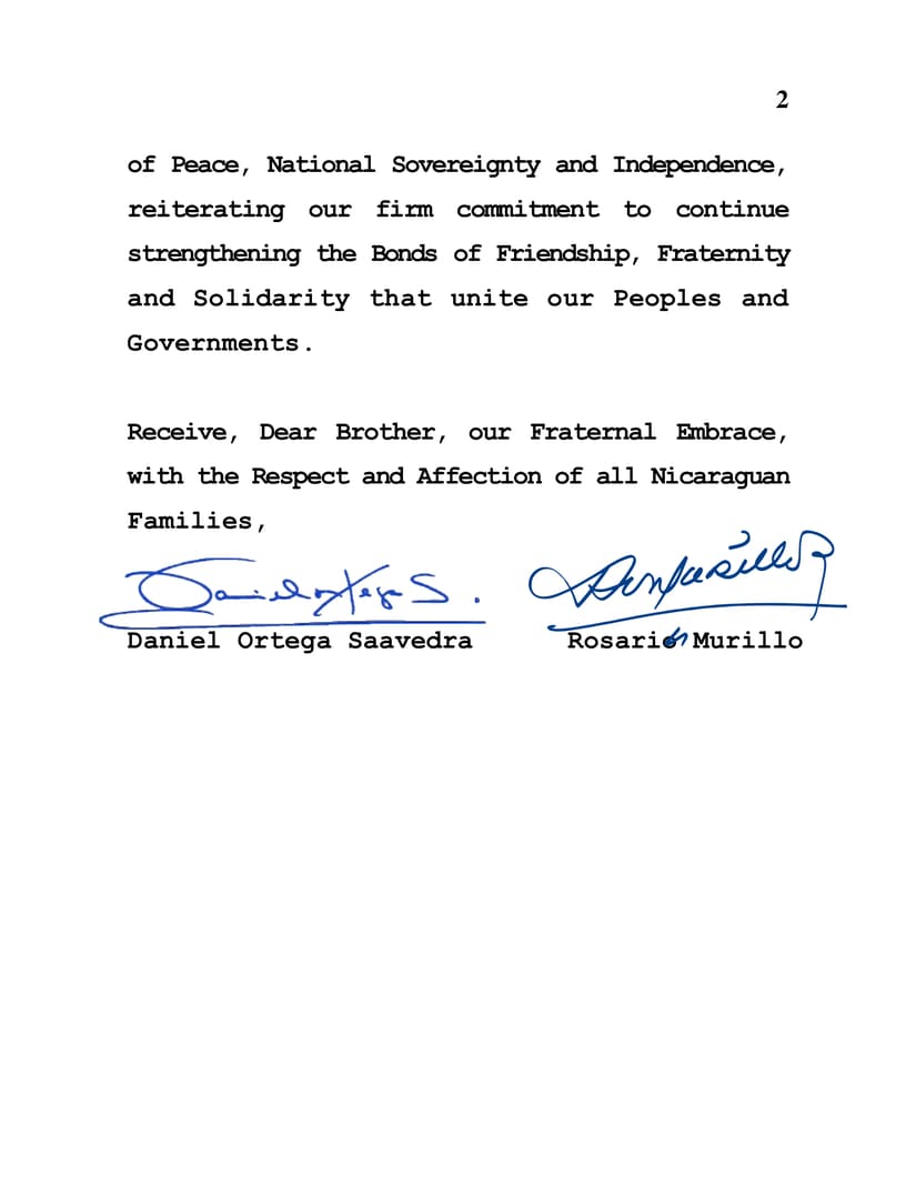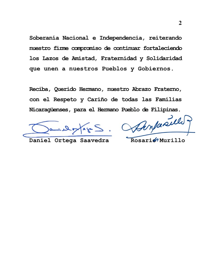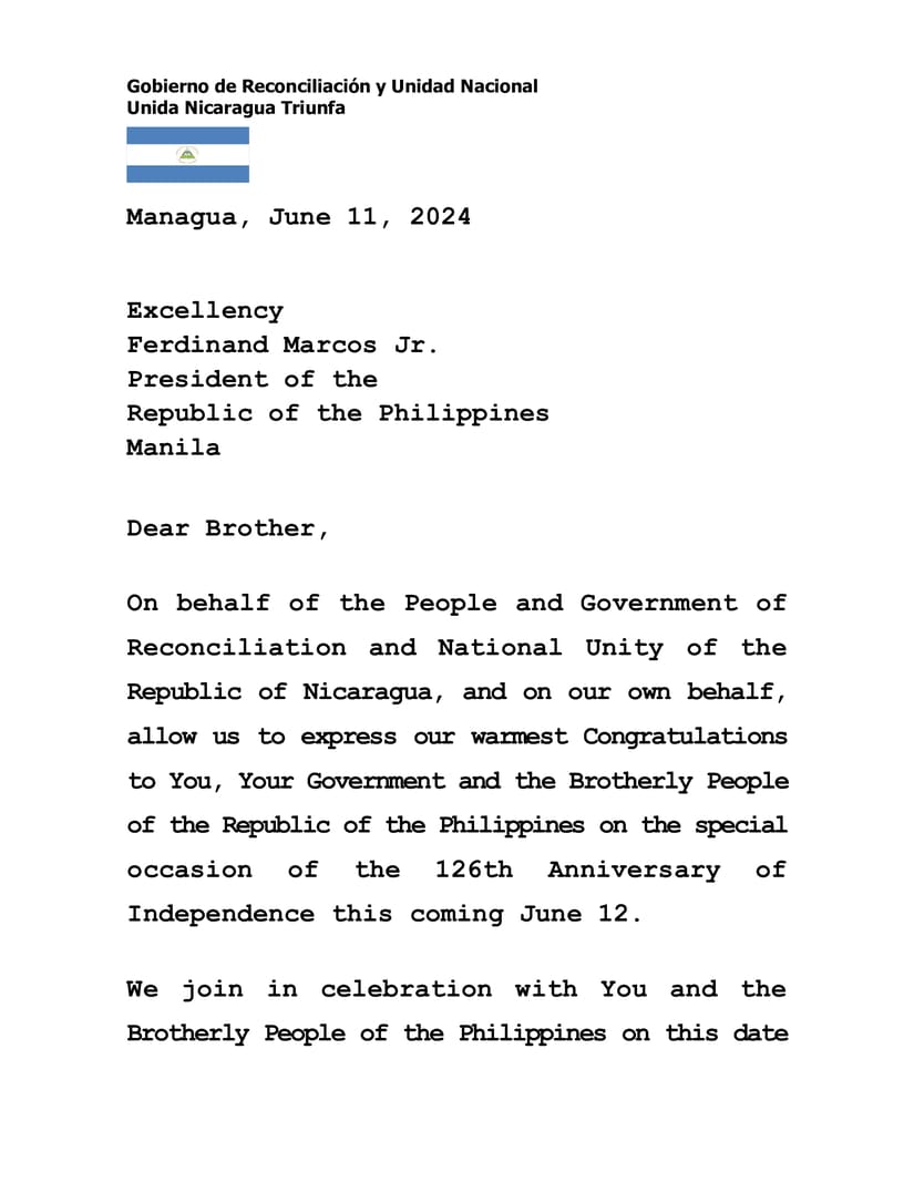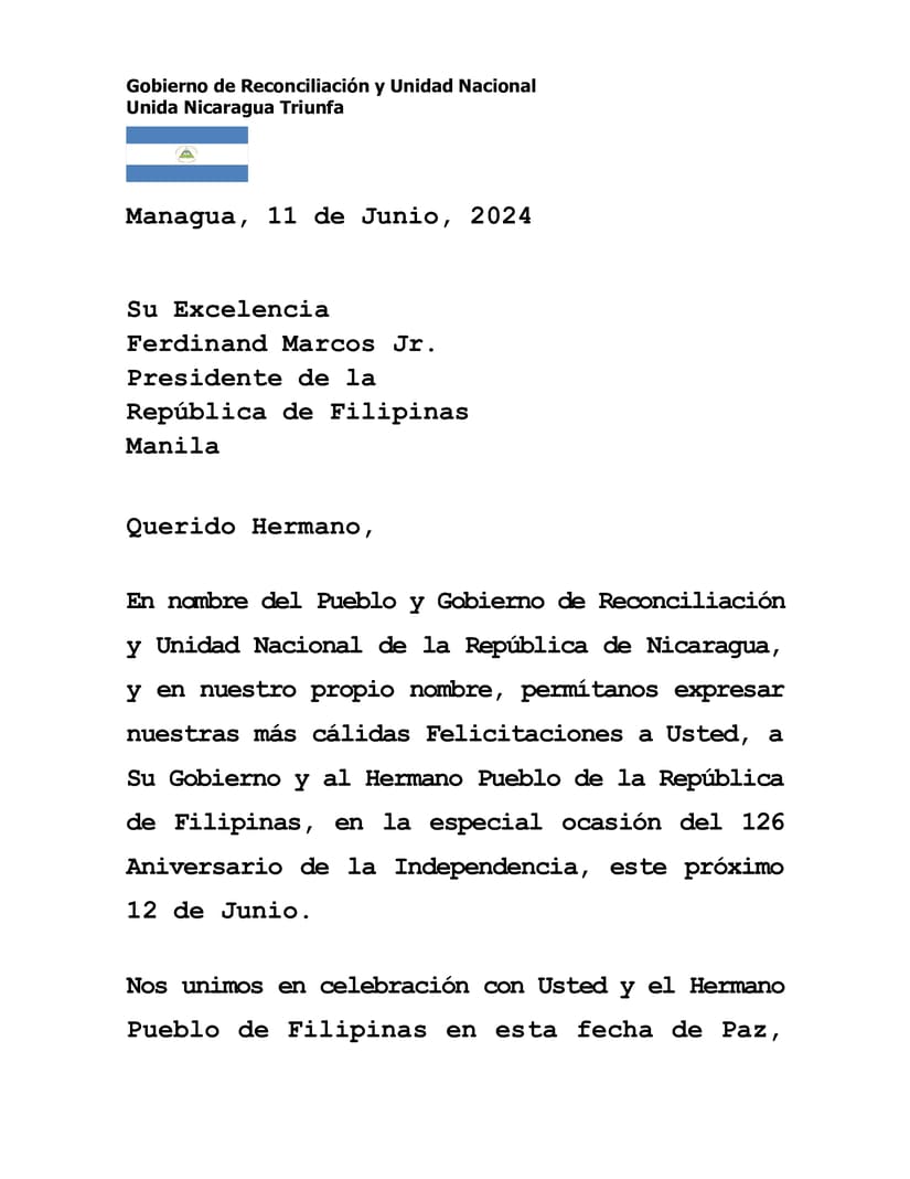 En nombre del Pueblo y Gobierno de Reconciliación y Unidad Nacional de la República de Nicaragua, y en nuestro propio nombre, permítanos expresar nuestras más cálidas Felicitaciones a Usted, a Su Gobierno y al Hermano Pueblo de la República de Filipinas, en la especial ocasión del 126 Aniversario de la Independencia, este próximo 12 de Junio.