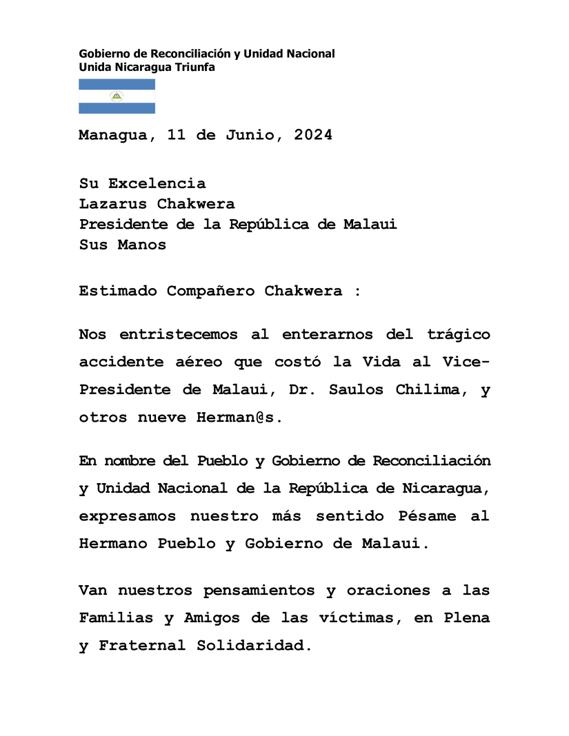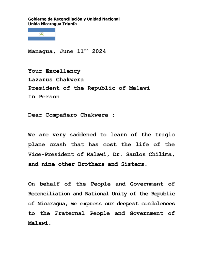 Mensaje de Condolencias del Presidente Comandante Daniel Ortega y la Vicepresidenta Compañera Rosario Murillo, a Su Excelencia, Compañero Lazarus Chakwera, Presidente de la República de Malaui, ante el trágico accidente aéreo que costó la Vida al Vicepresidente de Malaui, Doctor Saulos Chilima, y otros nueve Herman@s más.