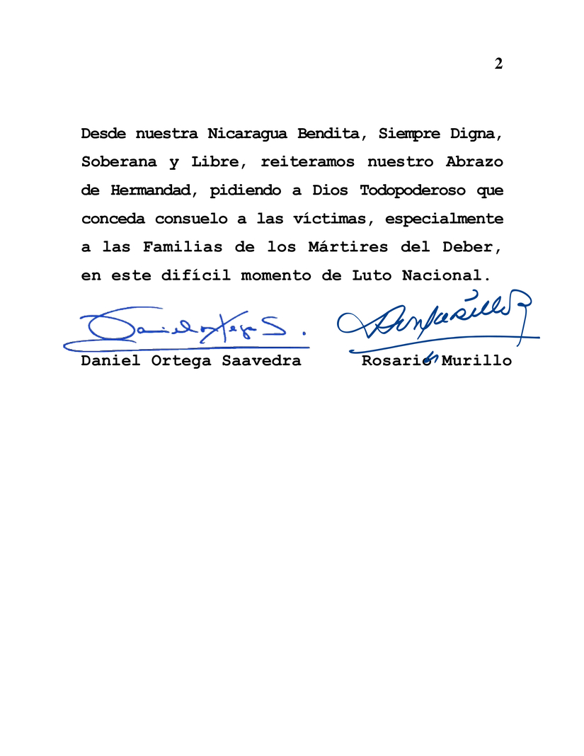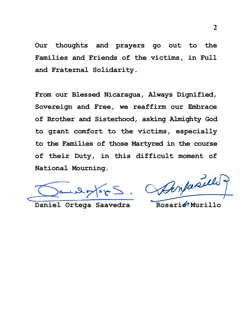 Desde nuestra Nicaragua Bendita, Siempre Digna, Soberana y Libre, reiteramos nuestro Abrazo de Hermandad, pidiendo a Dios Todopoderoso que conceda consuelo a las víctimas, especialmente a las Familias de los Mártires del Deber, en este difícil momento de Luto Nacional.
