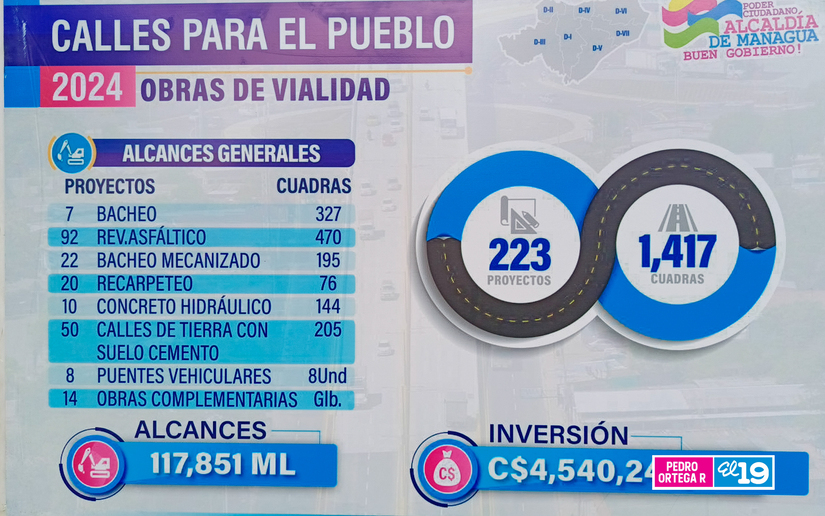 En este año se tiene proyectado ejecutar 223 obras para atender 1 mil 417 cuadras . El Presupuesto de Inversión Pública en obras corresponde a 4 mil 540 millones 242 mil 442 córdobas.