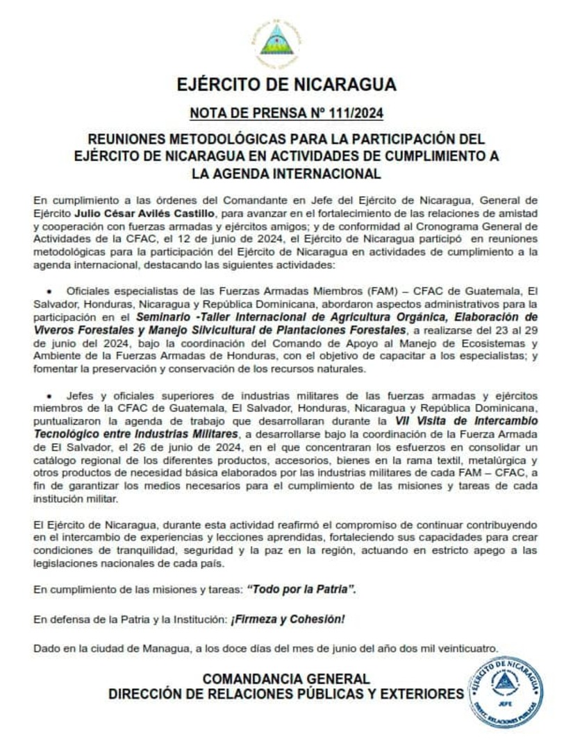 En cumplimiento a las órdenes del Comandante en Jefe del Ejército de Nicaragua, General de Ejército Julio César Avilés Castillo, para avanzar en el fortalecimiento de las relaciones de amistad y cooperación con fuerzas armadas y ejércitos amigos; y de conformidad al Cronograma General de Actividades de la CFAC, el 12 de junio de 2024, el Ejército de Nicaragua participó en reuniones metodológicas para la participación del Ejército de Nicaragua en actividades de cumplimiento a la agenda internacional, destacando las siguientes actividades: