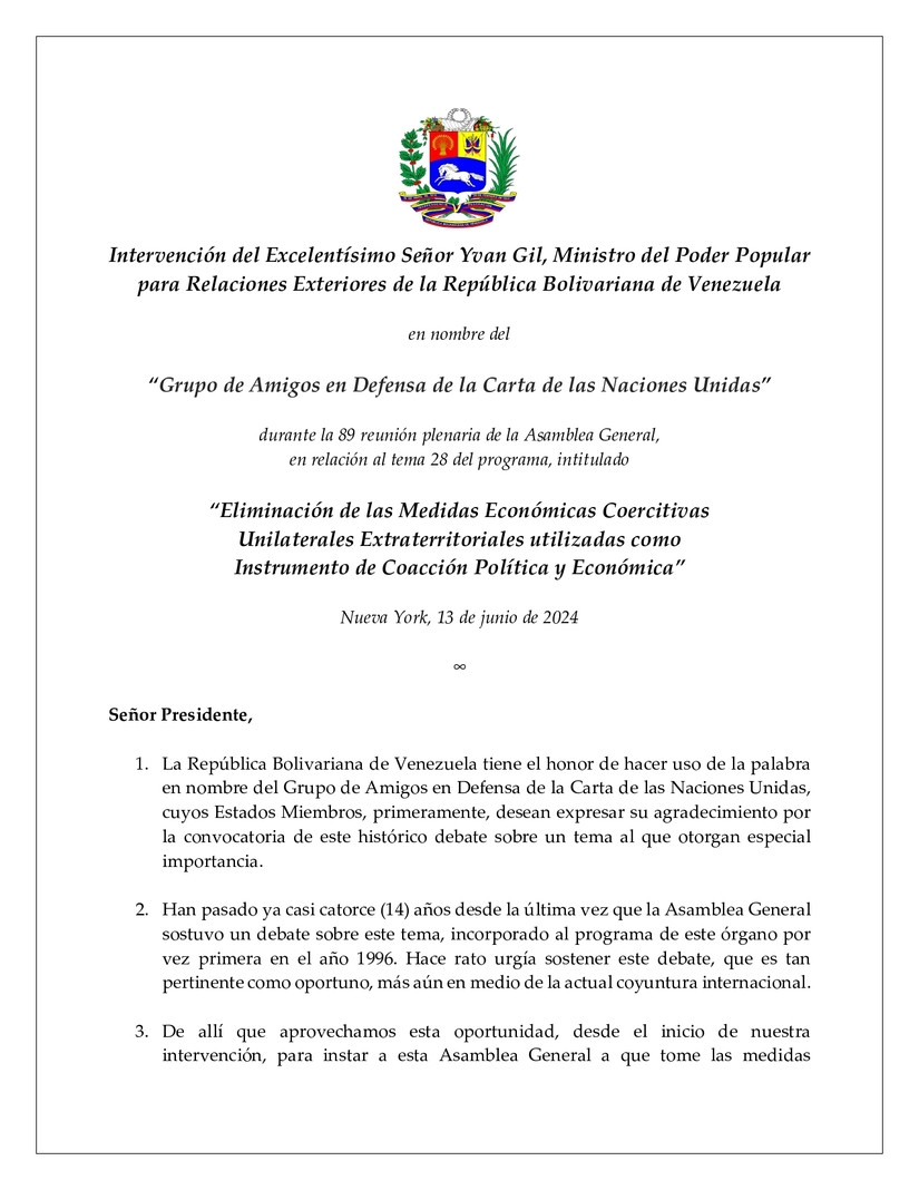 Intervención del Excelentísimo Señor Yvan Gil, Ministro del Poder Popular para Relaciones Exteriores de la República Bolivariana de Venezuela en nombre del “Grupo de Amigos en Defensa de la Carta de las Naciones Unidas” durante la 89 reunión plenaria de la Asamblea General, en relación al tema 28 del programa, intitulado “Eliminación de las Medidas Económicas Coercitivas Unilaterales Extraterritoriales utilizadas como Instrumento de Coacción Política y Económica”