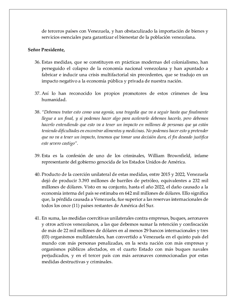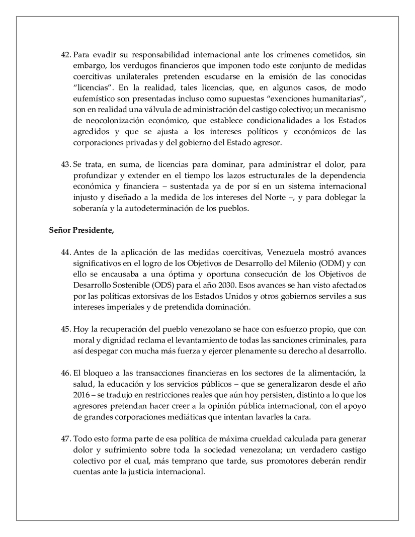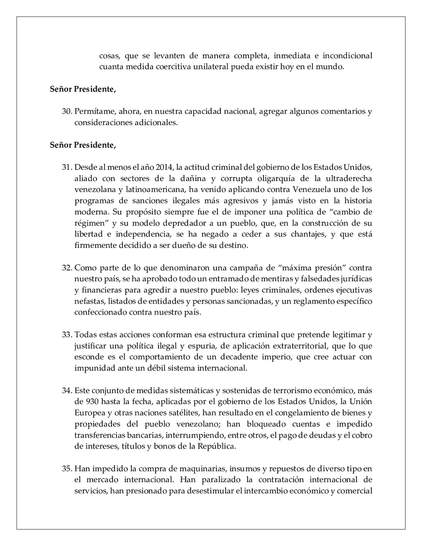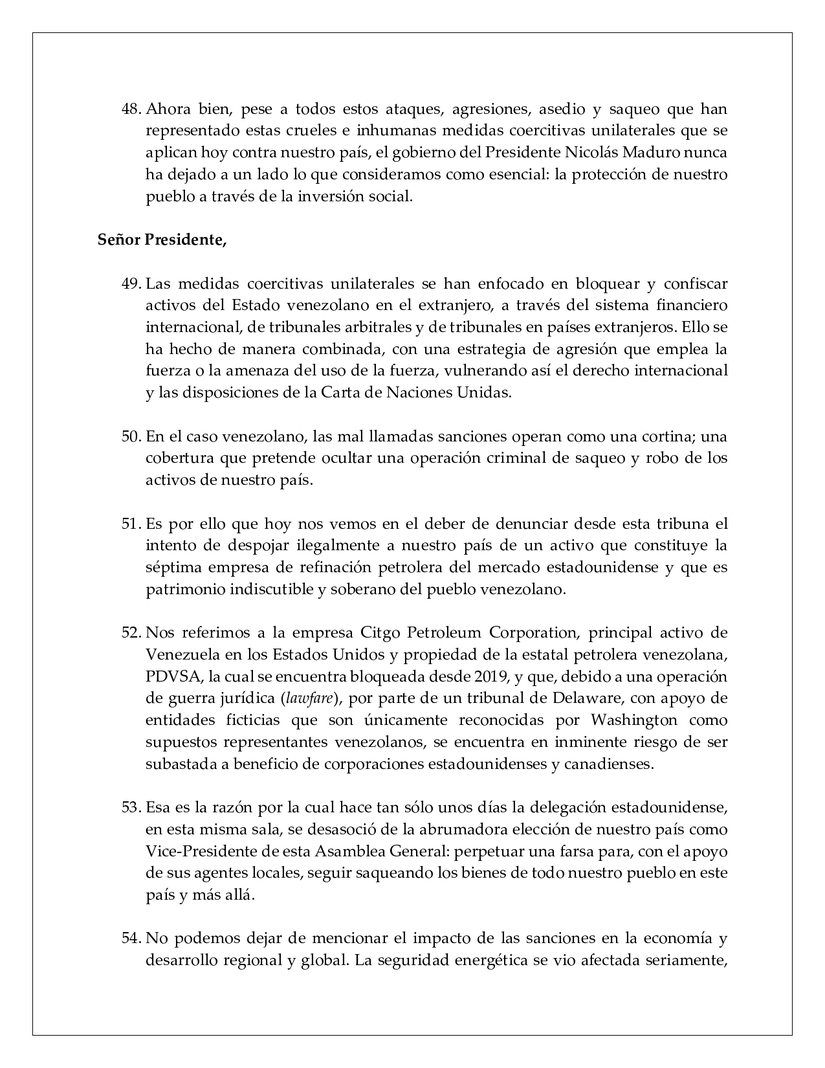 50. En el caso venezolano, las mal llamadas sanciones operan como una cortina; una cobertura que pretende ocultar una operación criminal de saqueo y robo de los activos de nuestro país.