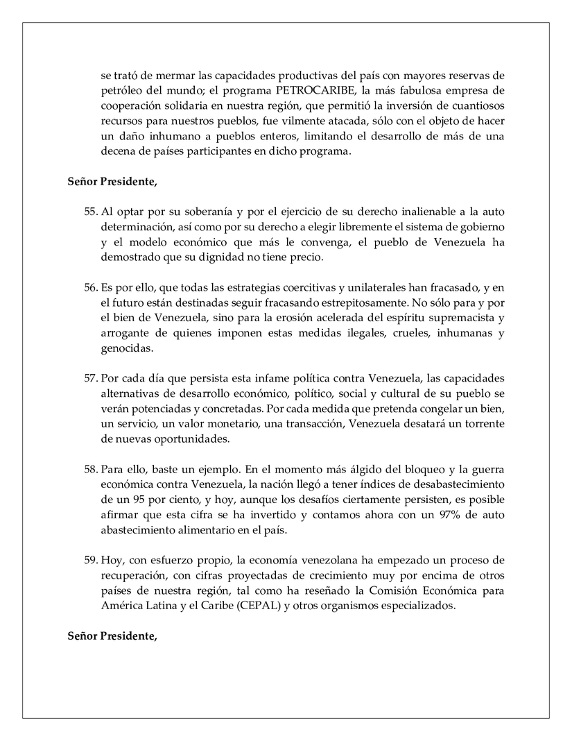 59. Hoy, con esfuerzo propio, la economía venezolana ha empezado un proceso de recuperación, con cifras proyectadas de crecimiento muy por encima de otros países de nuestra región, tal como ha reseñado la Comisión Económica para América Latina y el Caribe (CEPAL) y otros organismos especializados.