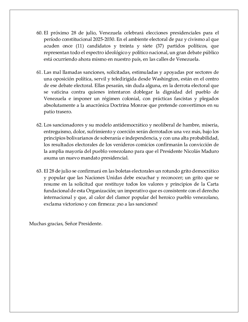 63. El 28 de julio se confirmará en las boletas electorales un rotundo grito democrático y popular que las Naciones Unidas debe escuchar y reconocer; un grito que se resume en la solicitud que restituye todos los valores y principios de la Carta fundacional de esta Organización; un imperativo que es consistente con el derecho internacional y que, al calor del clamor popular del heroico pueblo venezolano, exclama victorioso y con firmeza: ¡no a las sanciones!