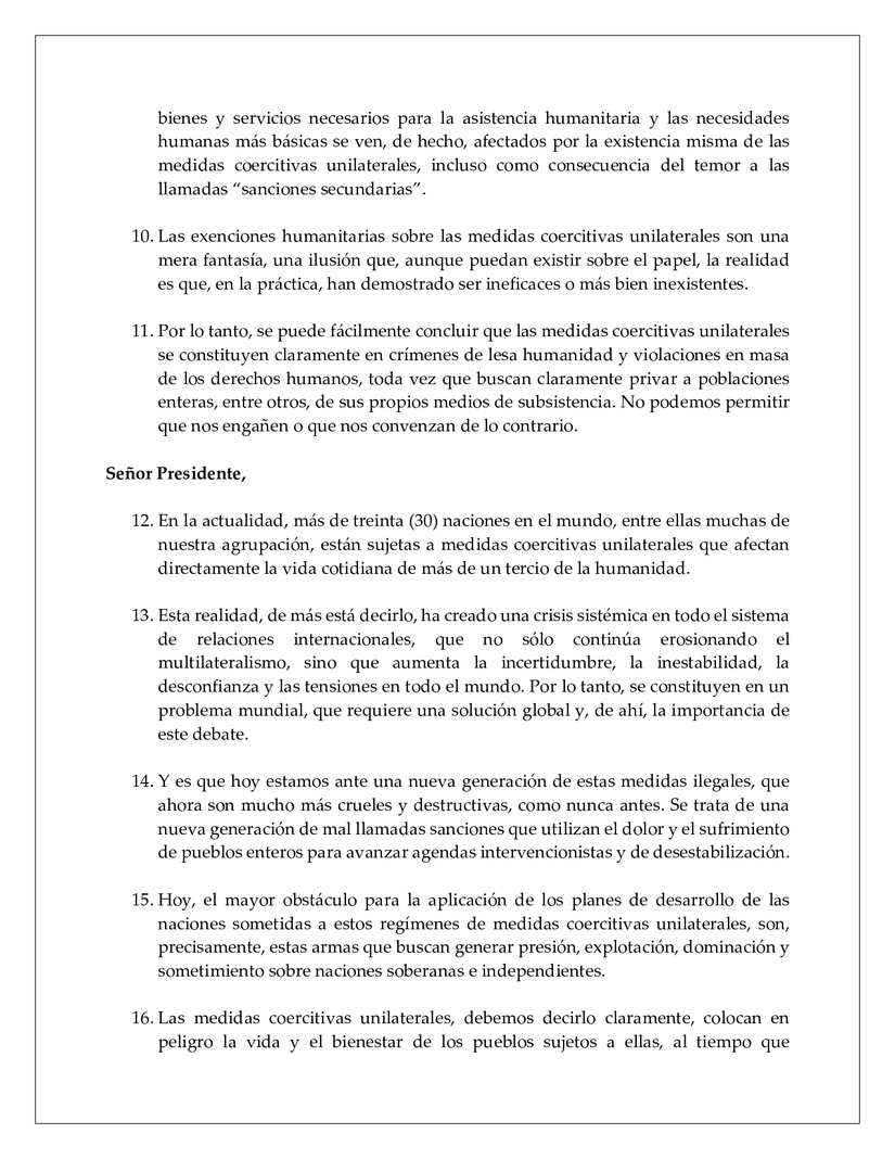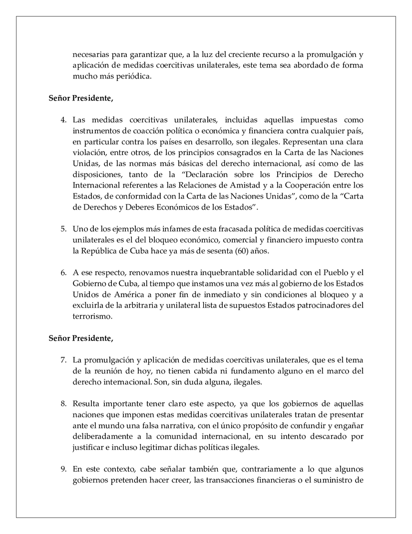 3. De allí que aprovechamos esta oportunidad, desde el inicio de nuestra intervención, para instar a esta Asamblea General a que tome las medidas necesarias para garantizar que, a la luz del creciente recurso a la promulgación y aplicación de medidas coercitivas unilaterales, este tema sea abordado de forma mucho más periódica.