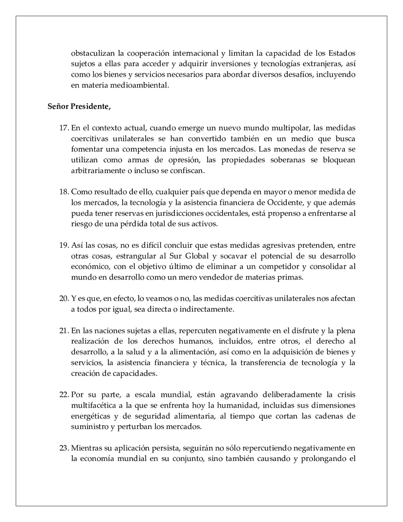 23. Mientras su aplicación persista, seguirán no sólo repercutiendo negativamente en la economía mundial en su conjunto, sino también causando y prolongando el sufrimiento humano en todo el mundo. Por ello, nuestro llamado es a poner fin de forma completa e inmediata a todas estas ilegales medidas.