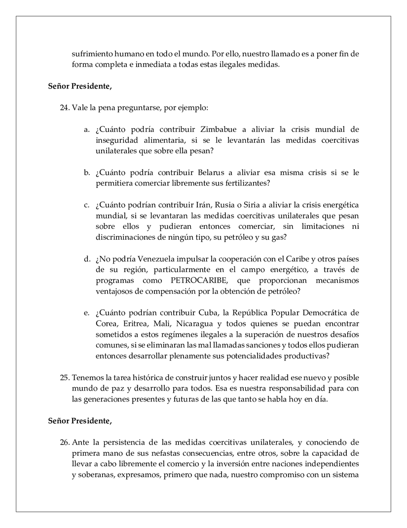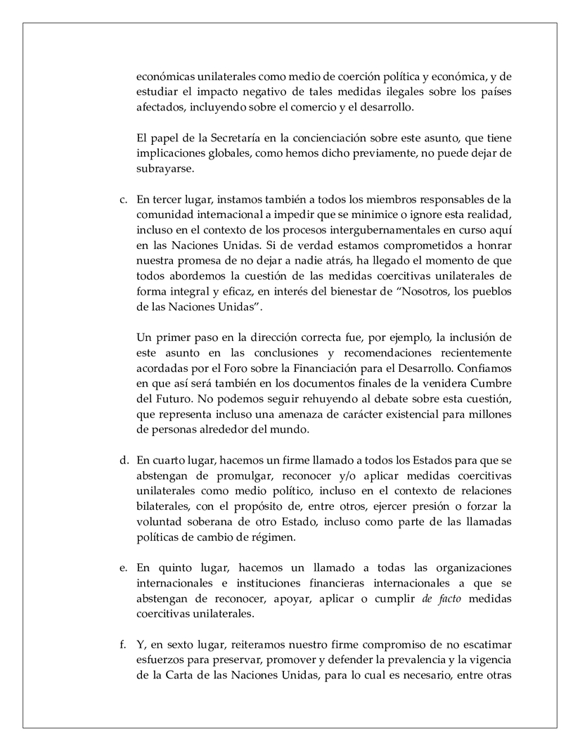 c. En tercer lugar, instamos también a todos los miembros responsables de la comunidad internacional a impedir que se minimice o ignore esta realidad, incluso en el contexto de los procesos intergubernamentales en curso aquí en las Naciones Unidas. Si de verdad estamos comprometidos a honrar nuestra promesa de no dejar a nadie atrás, ha llegado el momento de que todos abordemos la cuestión de las medidas coercitivas unilaterales de forma integral y eficaz, en interés del bienestar de “Nosotros, los pueblos de las Naciones Unidas”.
