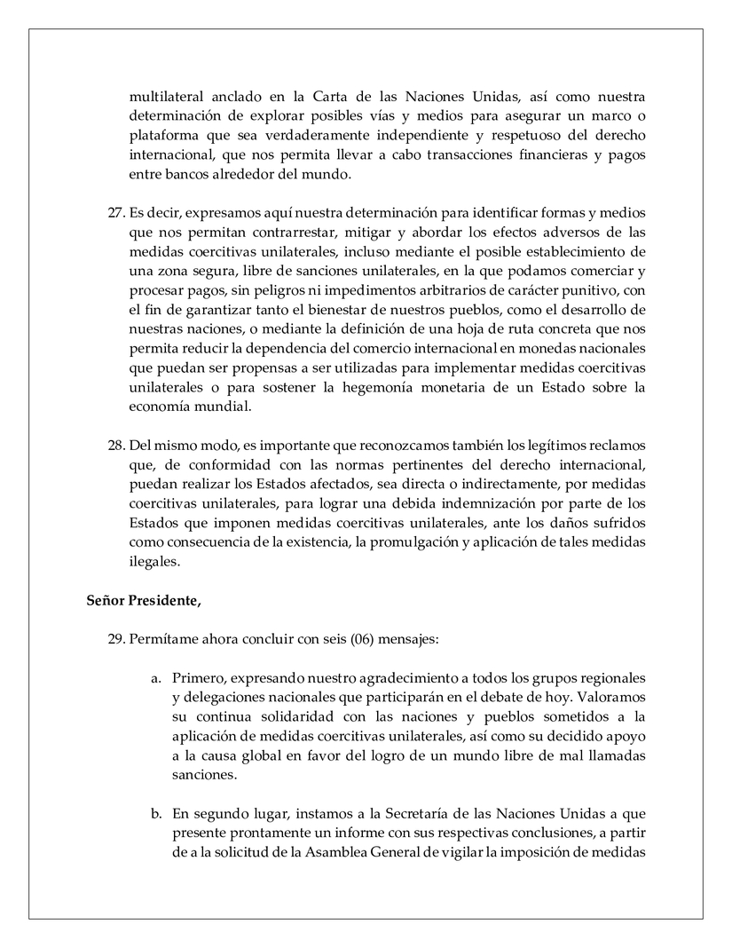 27. Es decir, expresamos aquí nuestra determinación para identificar formas y medios que nos permitan contrarrestar, mitigar y abordar los efectos adversos de las medidas coercitivas unilaterales, incluso mediante el posible establecimiento de una zona segura, libre de sanciones unilaterales, en la que podamos comerciar y procesar pagos, sin peligros ni impedimentos arbitrarios de carácter punitivo, con el fin de garantizar tanto el bienestar de nuestros pueblos, como el desarrollo de nuestras naciones, o mediante la definición de una hoja de ruta concreta que nos permita reducir la dependencia del comercio internacional en monedas nacionales que puedan ser propensas a ser utilizadas para implementar medidas coercitivas unilaterales o para sostener la hegemonía monetaria de un Estado sobre la economía mundial.