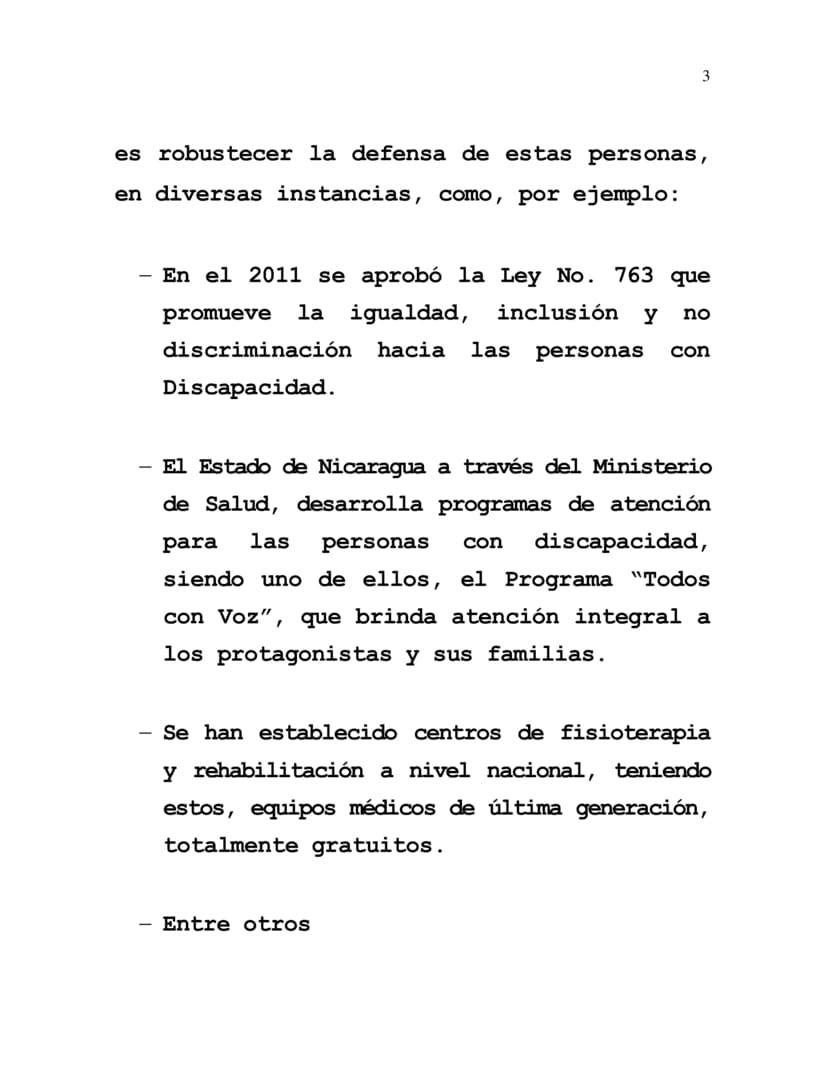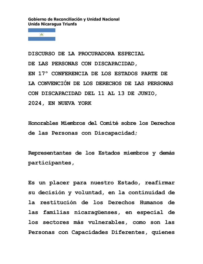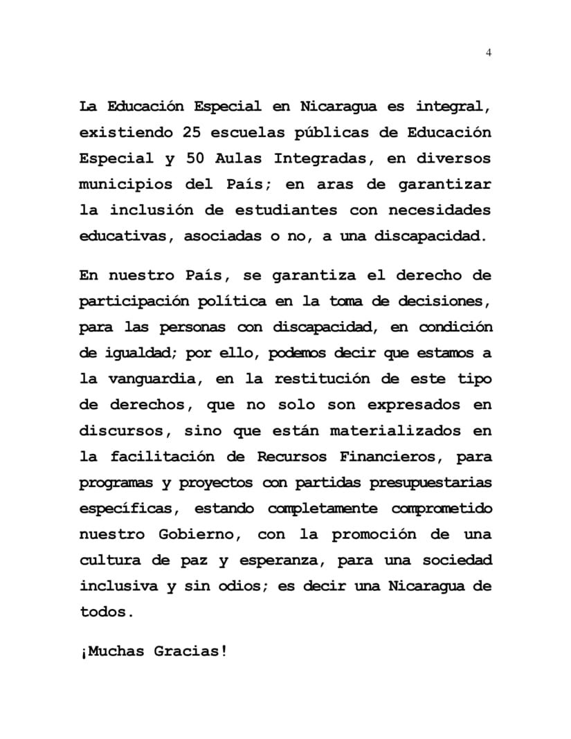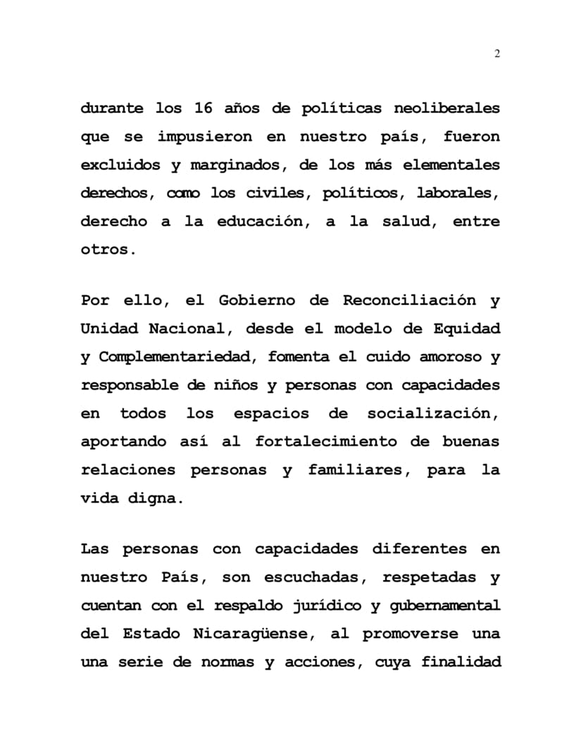 Es un placer para nuestro Estado, reafirmar su decisión y voluntad, en la continuidad de la restitución de los Derechos Humanos de las familias nicaragüenses, en especial de los sectores más vulnerables, como son las Personas con Capacidades Diferentes, quienes durante los 16 años de políticas neoliberales que se impusieron en nuestro país, fueron excluidos y marginados, de los más elementales derechos, como los civiles, políticos, laborales, derecho a la educación, a la salud, entre otros.