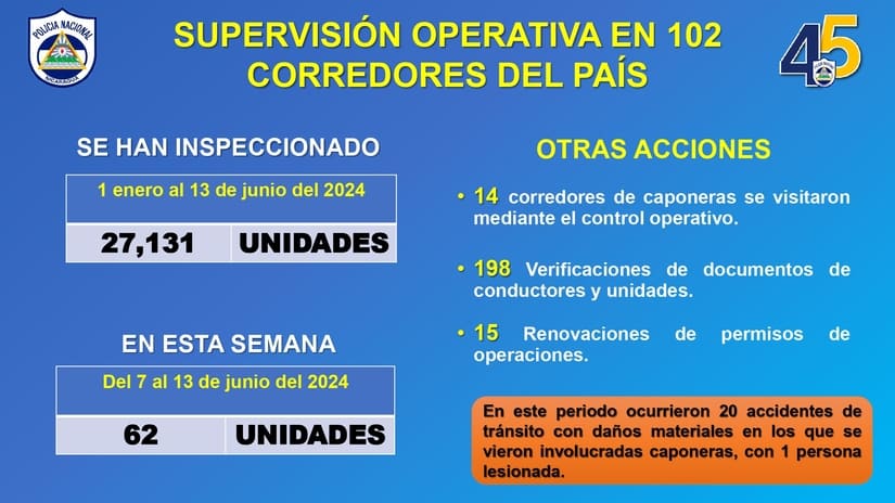 La Policía Nacional, a través del Inspector General, Comisionado General Jaime Venegas, informó que en lo que va del año en la supervisión operativa en los 102 corredores del país, se ha inspeccionado 27 mil 131 unidades, como parte del Plan para la Circulación Segura de Conductores y Pasajeros de Caponeras Originales y Adaptadas.
