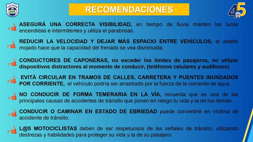 Para finalizar, el Comisionado General reiteró las recomendaciones a conductores, entre estas: no exceder los límites de pasajeros, no utilizar dispositivos distractores al momento de conducir, no conducir de manera temeraria o en estado de ebriedad y reiteró que deben de ser respetuosos de las señales de tránsito, utilizando destrezas y habilidades para proteger su vida y la de su pasajero.