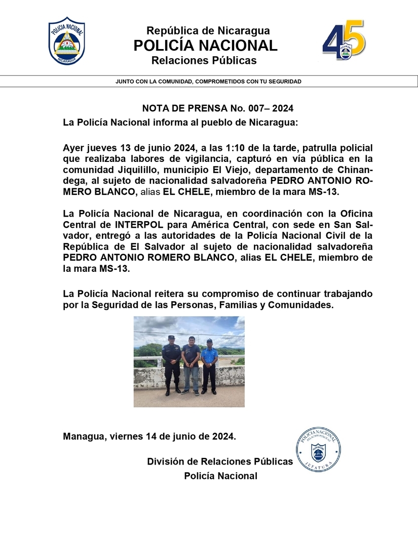 La Policía Nacional de Nicaragua, en coordinación con la Oficina Central de INTERPOL para América Central, con sede en San Sal- vador, entregó a las autoridades de la Policía Nacional Civil de la República de El Salvador al sujeto de nacionalidad salvadoreña PEDRO ANTONIO ROMERO BLANCO, alias EL CHELE, miembro de la mara MS-13.