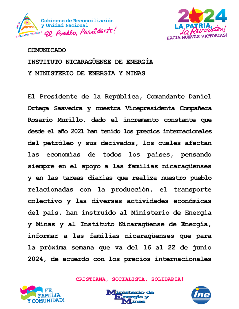 El Presidente de la República, Comandante Daniel Ortega Saavedra y nuestra Vicepresidenta Compañera Rosario Murillo, dado el incremento constante que desde el año 2021 han tenido los precios internacionales del petróleo y sus derivados, los cuales afectan las economías de todos los países, pensando siempre en el apoyo a las familias nicaragüenses y en las tareas diarias que realiza nuestro pueblo relacionadas con la producción, el transporte colectivo y las diversas actividades económicas del país, han instruido al Ministerio de Energía y Minas y al Instituto Nicaragüense de Energía, informar a las familias nicaragüenses que para la próxima semana que va del 16 al 22 de junio 2024, de acuerdo con los precios internacionales de los derivados del petróleo, los ajustes que se requieran no serán aplicados, manteniéndose los precios locales de los combustibles gasolinas y diésel sin variación, para beneficio de las familias nicaragüenses.