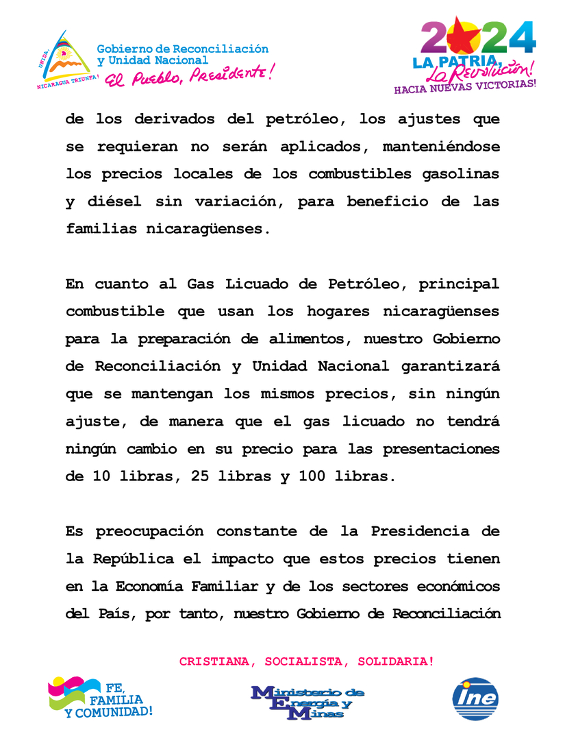 En cuanto al Gas Licuado de Petróleo, principal combustible que usan los hogares nicaragüenses para la preparación de alimentos, nuestro Gobierno de Reconciliación y Unidad Nacional garantizará que se mantengan los mismos precios, sin ningún ajuste, de manera que el gas licuado no tendrá ningún cambio en su precio para las presentaciones de 10 libras, 25 libras y 100 libras.