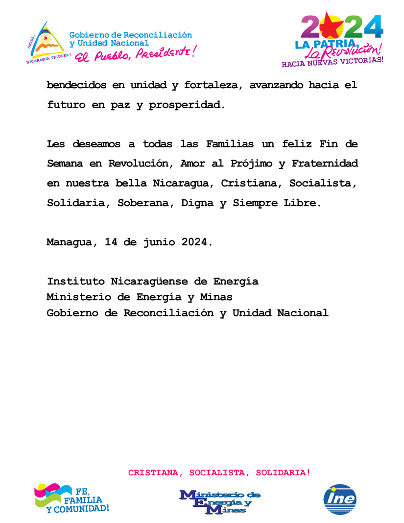 Les deseamos a todas las Familias un feliz Fin de Semana en Revolución, Amor al Prójimo y Fraternidad en nuestra bella Nicaragua, Cristiana, Socialista, Solidaria, Soberana, Digna y Siempre Libre.